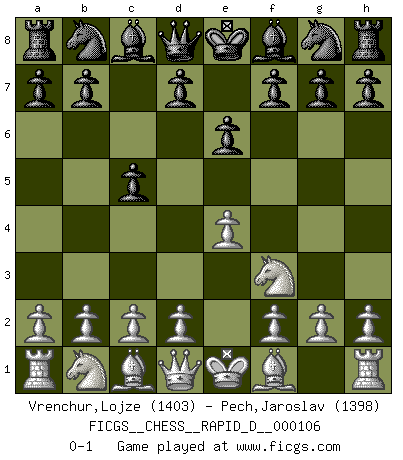 Last move : 0-1 2018 January 23 23:52:30 [Event "FICGS__CHESS__RAPID_D__000106"] [Site "FICGS"] [Date "2017.12.12"] [Round "1"] [White "Vrenchur,Lojze"] [Black "Pech,Jaroslav"] [Result "0-1"] [WhiteElo "1403"] [BlackElo "1398"] 1.e4 c5 2.Nf3 e6 0-1 This chess game has been lost on time (started : 2017.12.12 12:45:24) Sicilian defense Player Black won this chess game. Follow this game move after move (download)Fischer prefers to enter Chess history alone. (Miguel Najdorf) Wenn es im Universum noch irgendwo intelligente Lebewesen gibt, dann kennen sie Go. (Emanuel Lasker) Uno por uno, yo los acribillé, mi superioridad muy pronto se volvio aparente. (Jose Capablanca) Avant la finale, les dieux ont créé le milieu de partie. (Tarrasch) This is where the fun begins. (Anakin Skywalker in Star Wars ep.3)