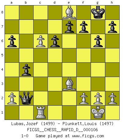 Last move : 1-0 2018 February 16 20:55:39 [Event "FICGS__CHESS__RAPID_D__000106"] [Site "FICGS"] [Date "2017.12.31"] [Round "1"] [White "Lubas,Jozef"] [Black "Plunkett,Louis"] [Result "1-0"] [WhiteElo "1499"] [BlackElo "1497"] 1.e4 c5 2.Nf3 g6 3.d4 cxd4 4.Nxd4 Bg7 5.c4 Nc6 6.Be3 Nf6 7.Nc3 O-O 8.Be2 a6 9.O-O d6 10.Rc1 Nxd4 11.Bxd4 Bd7 12.Qd2 Rc8 13.Rfd1 b5 14.e5 Ng4 15.e6 Bh6 16.exd7 Bxd2 17.dxc8Q Qxc8 18.Rxd2 b4 19.Nd5 Re8 20.c5 Qf5 21.Bxg4 Qxd5 22.c6 Qg5 23.Bd7 Qxd2 24.Be3 Qxb2 25.Bxe8 1-0 Sicilian : Hungarian variation Kingside Castling by player Black (move 7) Kingside Castling by player White (move 9) Promotion Queen by player White (move 17) Player White won this chess game. Follow this game move after move (download)Chess is no whit inferior to the violin, and we have a large number of professional violinists. (Mikhail Botvinnik) Wenn ich gewinne bin ich ein Genie. Wenn nicht, dann bin ich keines. (Robert James Fischer) No es suficiente ser un buen jugador, se debe también de jugar bién. (Siegbert Tarrasch) Ne tendez aucun piège pour le plaisir ! Ne jouez rien dans l'espoir que l'adversaire réagisse de façon stupide ! Prenez toujours pour acquis que l'adversaire va trouver le meilleur coup ! Ne jouez jamais de coup dans l'espoir que l'adversaire ne voie pas la menace ! Chacun de vos coups doit améliorer la position d'une façon ou d'une autre. A good programmer is someone who always looks both ways before crossing a one-way street. (Doug Linder)