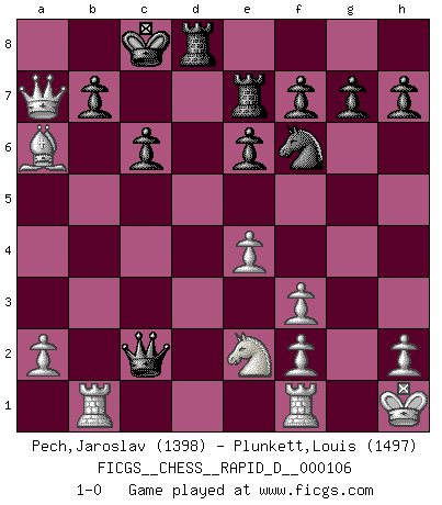 Last move : 1-0 2018 May 1 19:53:43 [Event "FICGS__CHESS__RAPID_D__000106"] [Site "FICGS"] [Date "2017.12.31"] [Round "1"] [White "Pech,Jaroslav"] [Black "Plunkett,Louis"] [Result "1-0"] [WhiteElo "1398"] [BlackElo "1497"] 1.d4 d5 2.c4 Nc6 3.Nc3 Nf6 4.Nf3 dxc4 5.e4 Bg4 6.Be3 e6 7.Bxc4 Bb4 8.Qc2 Bxf3 9.gxf3 Nxd4 10.Bxd4 Qxd4 11.Qa4+ c6 12.Qxb4 O-O-O 13.Rd1 Qe5 14.O-O Nh5 15.Ne2 Nf6 16.Rc1 Qg5+ 17.Kh1 Qd2 18.Qe7 Qxb2 19.Rb1 Rhe8 20.Qc5 Qc2 21.Qxa7 Re7 22.Ba6 1-0 QGD : Chigorin defense Queenside Castling by player Black (move 12) Kingside Castling by player White (move 14) Player White won this chess game. Follow this game move after move (download)It is not enough to be a good player... you must also play well. (Siegbert Tarrasch) Modernes Schach sorgt sich zuviel um Dinge wie Bauernstruktur usw. Vergessen Sie das, Schachmatt beendet das Spiel! (Nigel Short) El Ajedrez es el arte del análisis. (Mikhail Botvinnik) Ce qui est bien, c'est d'avoir tout un tas de pièces en prise : l'adversaire ne peut en prendre qu'une à la fois. Cité par Thierry Audin. Hardware: the parts of a computer that can be kicked. (Jeff Persis)