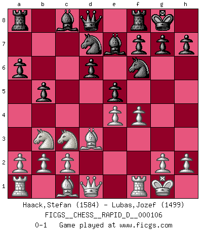 Last move : 0-1 2018 January 21 23:45:34 [Event "FICGS__CHESS__RAPID_D__000106"] [Site "FICGS"] [Date "2017.12.12"] [Round "1"] [White "Haack,Stefan"] [Black "Lubas,Jozef"] [Result "0-1"] [WhiteElo "1584"] [BlackElo "1499"] 1.e4 c5 2.Nf3 d6 3.d4 cxd4 4.Nxd4 Nf6 5.Nc3 a6 6.f4 e5 7.Nb3 Nbd7 8.Bc4 b5 9.Bd3 Be7 10.O-O O-O 0-1 This chess game has been lost on time (started : 2017.12.12 12:45:24) Sicilian : Najdorf, 6.f4 Kingside Castling by player White (move 10) Kingside Castling by player Black (move 10) Player Black won this chess game. Follow this game move after move (download)Capture of the adverse King is the ultimate but not the first object of the game. (William Steinitz) Schach ist Kampf, hauptsächlich jedoch gegen die eigenen Fehler. (Savielly Grigorievitsch Tartakower) Sin errores no puede haber brillantez. (Emanuel Lasker) C'est la seule position que je connaisse où les deux camps sont mals. Propos prêtés à V. Anand. Think like a man of action, act like a man of thought. (Henri Louis Bergson)