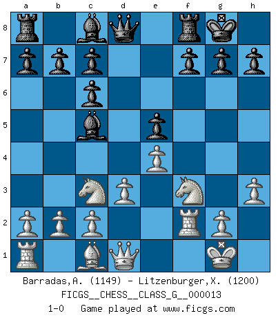 Last move : 1-0 2007 April 19 17:4:32 [Event "FICGS__CHESS__CLASS_G__000013"] [Site "FICGS"] [Date "2007.04.17"] [Round "1"] [White "Barradas,Anderson"] [Black "Litzenburger,Xavier"] [Result "1-0"] [WhiteElo "1149"] [BlackElo "1200"] 1.e4 e5 2.Nf3 Nc6 3.Bb5 Nf6 4.Bxc6 dxc6 5.d3 Bc5 6.O-O Ng4 7.h3 Nxf2 8.Rxf2 O-O 9.Nc3 1-0 Ruy Lopez : Berlin defense Kingside Castling by player White (move 6) Kingside Castling by player Black (move 8) Player White won this chess game. Follow this game move after move (download)I'm not a materialistic person, in that, I don't suffer the lack or loss of money. The absence of worldly goods I don't look back on. For Chess is a way I can be as materialistic as I want without having to sell my soul. (Jamie Walter Adams) Wie ich sie so einen nach dem anderen nieder mähte wurde meine Überlegenheit offensichtlich. (José Raúl Capablanca) Cuando le juegas a Fischer, no es una cuestion de si vas a ganar o perder. Es una cuestion de si vas a sobrevivir. (Boris Spassky) Aux échecs, les retours au sommet sont rares : les dommages psychologiques consécutifs à une défaite sont trop sévères. (Daily Telegraph) Work expands to fill the time available. (C. Northcote Parkinson, in Parkinson's Laws)