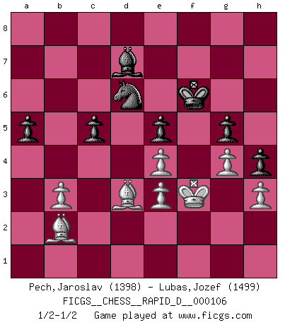 Last move : 1/2-1/2 2018 May 12 8:28:34 [Event "FICGS__CHESS__RAPID_D__000106"] [Site "FICGS"] [Date "2017.12.12"] [Round "1"] [White "Pech,Jaroslav"] [Black "Lubas,Jozef"] [Result "1/2-1/2"] [WhiteElo "1398"] [BlackElo "1499"] 1.c4 e5 2.Nc3 Nf6 3.Nf3 Nc6 4.g3 Bb4 5.Bg2 O-O 6.O-O d6 7.d3 h6 8.Na4 a5 9.b3 Re8 10.Bb2 Bd7 11.h3 Bc5 12.Nxc5 dxc5 13.Nd2 Qe7 14.Re1 Qd6 15.Nb1 Nd8 16.Nc3 Bc6 17.Ne4 Nxe4 18.dxe4 Qg6 19.Qd3 b6 20.Kh2 Nb7 21.a4 Rad8 22.Qc2 h5 23.f3 Nd6 24.Rad1 h4 25.g4 f6 26.e3 Kf7 27.Qf2 Qh7 28.Kg1 Rd7 29.Rd2 g5 30.Bf1 Ke7 31.Bc3 Kd8 32.Bd3 Kc8 33.Qe2 Qe7 34.Bc2 Nb7 35.Red1 Rxd2 36.Rxd2 Rd8 37.Kf1 Rxd2 38.Qxd2 Nd8 39.Ke2 Qd7 40.Qxd7+ Kxd7 41.f4 Ke6 42.fxg5 fxg5 43.Kf3 Nf7 44.Bd3 Nd8 45.Bc2 Kf6 46.Bb2 Be8 47.Bc3 Nc6 48.Bd1 Nb4 49.Ba1 Bg6 50.Bc3 c6 51.Be2 Be8 52.Bd1 Bd7 53.Be2 Na2 54.Bd2 Be6 55.Bd3 Nb4 56.Bf1 Bf7 57.Bc3 Be8 58.Be2 Na6 59.Bd3 Nc7 60.Bb2 Bd7 61.Bc1 Ne8 62.Bb2 Nc7 63.Bc2 b5 64.axb5 cxb5 65.cxb5 Nxb5 66.Bd3 Nd6 1/2-1/2 English Opening Kingside Castling by player Black (move 5) Kingside Castling by player White (move 6) This chess game ended in a draw. Follow this game move after move (download)Your body has to be in top condition. Your Chess deteriorates as your body does. You can't separate body from mind. (Bobby Fischer) Offener Brief an US-Präsident Bush anlässlich der Verhaftung Bobby Fishers: Verhaften Sie mich. Stecken Sie mich in dieselbe Zelle wie Bobby Fisher und geben Sie uns ein Schachspiel mit. (Boris Vassilievich Spassky) Yo adoro todas la posiciones. Denme una partida posicional difícil, y la jugaré. Pero posiciones totalmente ganadas, no las tolero. (Hein Donner) Votre prénom est 'Tactique', votre deuxième prénom est 'Tactique' et votre nom est 'Tactique'. (Ken Smith) That's absurd. I love it. (Gregory House, House M.D.)