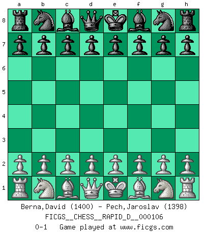 Last move : 0-1 2018 February 12 2:8:37 [Event "FICGS__CHESS__RAPID_D__000106"] [Site "FICGS"] [Date "2018.01.12"] [Round "1"] [White "Berna,David"] [Black "Pech,Jaroslav"] [Result "0-1"] [WhiteElo "1400"] [BlackElo "1398"] 0-1 This chess game has been lost on time (started : 2018.01.12 15:35:18) Player Black won this chess game. Follow this game move after move (download)There's never before been a Chess player with such a thorough knowledge of the intricacies of the game and such an absolutely indomitable will to win. I think Bobby is the greatest player that ever lived. (Lisa Lane) Schach ist ein Kampf gegen den Fehler. (Johannes Herrman Zukertort) La única cosa que los jugadores de Ajedrez tienen en común, es el Ajedrez. (Lodewijk Prins) Mais l'homme est une créature légère et illogique : semblable au joueur d'échecs, il n'aime que le processus du but à atteindre, non le but lui-même. (Dostoïevsky) There are more things in heaven and earth than practically anywhere else. (Unknown)