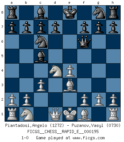 Last move : 1-0 2018 January 20 23:44:44 [Event "FICGS__CHESS__RAPID_E__000195"] [Site "FICGS"] [Date "2017.12.13"] [Round "1"] [White "Piantadosi,Angelo"] [Black "Puzanov,Vasyl"] [Result "1-0"] [WhiteElo "1272"] [BlackElo "0730"] 1.e4 e5 2.Nf3 Nc6 3.d4 exd4 4.Nxd4 Bc5 5.Be3 Qf6 6.c3 1-0 This chess game has been lost on time (started : 2017.12.13 21:5:15) Scotch game Player White won this chess game. Follow this game move after move (download)Many Chess players were surprised when after the game, Fischer quietly explained: 'I had already analyzed this possibility' in a position which I thought was not possible to foresee from the opening. (Mikhail Tal) Die Idee von Capablanca, Schach als Fach in den Schulen zu lehren, ist großartig. (Fidel Castro) El Ajedrez es el juego mas altamente simbólico, pero las agresiones estan por lo tanto aún mas francamente representadas en la partida. Tal vez comenzo como un juego de guerra; Algo como la representación de una batalla en miniatura entre las fuerzas de dos reinos. (Karl Meninger) Le joueur d'Echecs qui veut atteindre le top est obligé de développer son propre credo créatif. Alexeï Stepanovicth Souétine. Il est facile d'écrire des livres ! Ce qui est difficile, c'est de jouer ! (Alexeï Stepanovicth Souétine) Plans are ideas that never come to fruition. (Daniel Parmet)