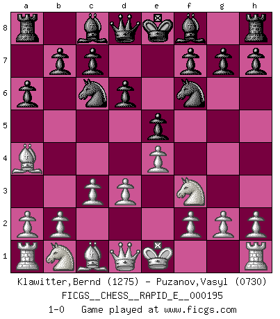 Last move : 1-0 2018 January 19 11:42:7 [Event "FICGS__CHESS__RAPID_E__000195"] [Site "FICGS"] [Date "2017.12.13"] [Round "1"] [White "Klawitter,Bernd"] [Black "Puzanov,Vasyl"] [Result "1-0"] [WhiteElo "1275"] [BlackElo "0730"] 1.e4 e5 2.Nf3 Nc6 3.Bb5 a6 4.Ba4 Nf6 5.d3 d6 6.c3 1-0 This chess game has been lost on time (started : 2017.12.13 21:5:15) Ruy Lopez : Anderssen variation Player White won this chess game. Follow this game move after move (download)You cannot play at Chess if you are kind-hearted. (French Proverb) Heutzutage gewinnt im Turnier nicht derjenige Spieler, der weitreichende Pläne entwirft, sondern einfach jener, der Zug um Zug kämpft. (David Bronstein) Si no le temes a Spassky, entonces elimino el elemento del dinero. (Jim Slater) Que feriez-vous si vous étiez en train de jouer aux échecs et que la fin du monde arrive ? Je continuerais à jouer. (Saint Borromée) CHESS, n. f. [echecs, Fr.] A nice and abstruse game, in which two sets of puppets are moved in opposition to each other. (Dr Samuel Johnson, A Dictionary Of The English Language, 1755)