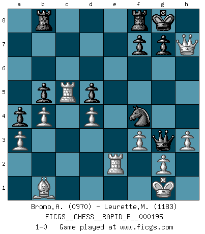 Last move : 1-0 2017 December 19 15:27:43 [Event "FICGS__CHESS__RAPID_E__000195"] [Site "FICGS"] [Date "2017.12.13"] [Round "1"] [White "Bromo,Alexis"] [Black "Leurette,Marc-Antoine"] [Result "1-0"] [WhiteElo "0970"] [BlackElo "1183"] 1.d4 d5 2.c4 e6 3.a3 Nf6 4.Nc3 Be7 5.h3 b6 6.Nf3 Bb7 7.e3 O-O 8.Be2 c5 9.O-O cxd4 10.exd4 a5 11.Be3 dxc4 12.Bxc4 Bd5 13.Nxd5 exd5 14.Ba2 a4 15.Re1 b5 16.Rc1 Na6 17.Bf4 Bd6 18.Bxd6 Qxd6 19.Ne5 Nb8 20.b4 Nbd7 21.Nxd7 Qxd7 22.f3 Qd6 23.Qd3 Rab8 24.Rc5 Qg3 25.Re2 Nh5 26.Bb1 Nf4 27.Qxh7+ 1-0 Queen's gambit declined Kingside Castling by player Black (move 7) Kingside Castling by player White (move 9) Player White won this chess game. Follow this game move after move (download)The stomach is an essential part of the Chess master. (Bent Larsen) Eine Person mit durchschnittlichem IQ kann etwa eine ELO von 2000 erreichen. (Jonathan Levitt) Tu sabes que vas a perder. Aún cuando tenía la ventaja, yo sabía que iba a perder. - al estar jugando con Fischer (Andrew Soltis) Demandez au pauvre Cg1 ce qu'il en pense. Eduard Gufeld à propos de la variante Saemisch de l'Est-Indienne. A shortcut is the longest distance between two points. (Don Groves)