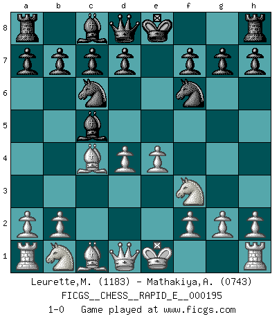 Last move : 1-0 2018 January 20 23:44:44 [Event "FICGS__CHESS__RAPID_E__000195"] [Site "FICGS"] [Date "2017.12.13"] [Round "1"] [White "Leurette,Marc-Antoine"] [Black "Mathakiya,Azaz"] [Result "1-0"] [WhiteElo "1183"] [BlackElo "0743"] 1.e4 e5 2.Nf3 Nc6 3.Bc4 Bc5 4.c3 Nf6 5.d4 exd4 6.cxd4 1-0 This chess game has been lost on time (started : 2017.12.13 21:5:15) Giuoco Piano Player White won this chess game. Follow this game move after move (download)I'm not a materialistic person, in that, I don't suffer the lack or loss of money. The absence of worldly goods I don't look back on. For Chess is a way I can be as materialistic as I want without having to sell my soul. (Jamie Walter Adams) Die jungen Leute sollen verstehen, dass sie noch etwas von mir lernen können und müssen. (Viktor Kortschnoi) Morphy probablemente fue el genio más grande de todos. (Bobby Fischer) Le temps de noter son nom sur la feuille de partie, j'étais déjà en zeitnot ! D'un modeste amateur apparié lors de la première ronde d'un open contre le grand-maître Azmaïparashvili. The real danger is not that computers will begin to think like men, but that men will begin to think like computers. (Sydney J. Harris)