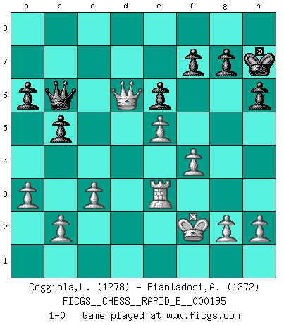 Last move : 1-0 2018 March 8 0:25:13 [Event "FICGS__CHESS__RAPID_E__000195"] [Site "FICGS"] [Date "2018.01.02"] [Round "1"] [White "Coggiola,Leandro Damian"] [Black "Piantadosi,Angelo"] [Result "1-0"] [WhiteElo "1278"] [BlackElo "1272"] 1.e4 c5 2.Nf3 d6 3.d4 cxd4 4.Nxd4 Nf6 5.Nc3 a6 6.Be2 e6 7.O-O Be7 8.Bg5 O-O 9.Re1 Nc6 10.Qd2 Nxd4 11.Qxd4 Qc7 12.Rad1 b5 13.a3 Bb7 14.f3 Rfd8 15.Qf2 h6 16.Bf4 Qc5 17.Be3 Qc7 18.Qg3 Kh8 19.Qf2 d5 20.Bb6 Qc8 21.Bxd8 Bxd8 22.e5 Nd7 23.Qg3 d4 24.Rxd4 Bb6 25.Red1 Bxd4+ 26.Rxd4 Qc5 27.Qf2 Qc7 28.f4 Rc8 29.Rd3 Nc5 30.Rh3 Ne4 31.Nxe4 Bxe4 32.c3 Rd8 33.Re3 Qc6 34.Bf3 Bxf3 35.Qxf3 Rd1+ 36.Qxd1 Qb6 37.Kf2 Kh7 38.Qd6 1-0 Sicilian : Najdorf, Opovcensky variation Kingside Castling by player White (move 7) Kingside Castling by player Black (move 8) Player White won this chess game. Follow this game move after move (download)There are tough players and nice guys, and I'm a tough player. (Bobby Fischer) Jeder leidlich begabte Spieler, er braucht keineswegs hervorragend veranlagt zu sein, kann es zum Meister bringen. Aber das ist ja auch gar nicht nötig! Der richtige Standpunkt ist es, zu seinem Vergnügen zu spielen, und man glaube ja nicht, dass der Genuss proportional dem Können sei. (Siegbert Tarrasch) Si yo gano un torneo, yo lo gano por mí mismo. Yo hago las jugadas. Nadie me ayuda. (Bobby Fischer) J'ai toujours senti une vague pitié pour l'homme qui ne connaît rien aux échecs, tout comme j'en aurais pour un homme ignorant de l'amour. Les Echecs, comme la musique ou comme l'amour, ont le pouvoir de rendre heureux. (Siegbert Tarrasch) All politicians must be presumed guilty until they are proven innocent. (Dinesh De Silva)