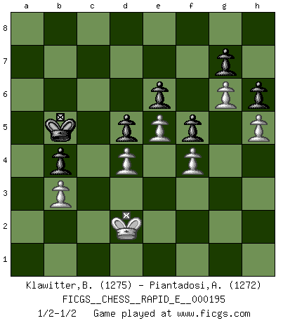Last move : 1/2-1/2 2018 March 19 3:40:27 [Event "FICGS__CHESS__RAPID_E__000195"] [Site "FICGS"] [Date "2017.12.13"] [Round "1"] [White "Klawitter,Bernd"] [Black "Piantadosi,Angelo"] [Result "1/2-1/2"] [WhiteElo "1275"] [BlackElo "1272"] 1.e4 c6 2.d4 d5 3.e5 Bf5 4.Nc3 e6 5.g4 Bg6 6.h4 h6 7.h5 Bh7 8.Bd3 Bxd3 9.Qxd3 c5 10.f4 Nc6 11.Nge2 cxd4 12.Nxd4 Nxd4 13.Qxd4 Rc8 14.Qa4+ Qd7 15.Qxd7+ Kxd7 16.Rh2 Ne7 17.Be3 Nc6 18.Nb5 a6 19.Nd4 Nxd4 20.Bxd4 Bc5 21.c3 Bxd4 22.cxd4 Rc4 23.Rd1 Rhc8 24.Rhd2 b5 25.a3 Rc1 26.Rxc1 Rxc1+ 27.Kf2 Kc6 28.Kf3 a5 29.Rd3 b4 30.axb4 axb4 31.b3 Rc3 32.Ke3 Rxd3+ 33.Kxd3 f5 34.g5 Kb5 35.g6 Ka5 36.Kd2 Kb5 1/2-1/2 Caro-Kann : Advance variation This chess game ended in a draw. Follow this game move after move (download)In order to improve your game, you must study the endgame before everything else, for whereas the endings can be studied and mastered by themselves, the middle game and the opening must be studied in relation to the endgame. (Jose Raul Capablanca) Ohne Fehler kann es keine Brillanz geben. (Emanuel Lasker) Después de una mala apertura, hay una esperanza en el juego medio. Pero una vez que estas en finales, el momento de la verdad ha llegado. (Edmar Mednis) Il n'y a plus de joueurs du niveau de Jacob Murray dont la seule quête est le beau jeu, le plaisir de voir les pièces construire quelque chose. Sur 10 idées à la minute, 9 seront sans intérêt, la dernière s'avèrera géniale. (Christian Bauer) There is a very easy way to return from a casino with a small fortune : go there with a large one. (Jack Yelton)