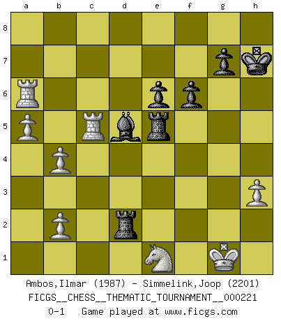 Last move : 0-1 2018 February 6 16:5:1 [Event "FICGS__CHESS__THEMATIC_TOURNAMENT__000221"] [Site "FICGS"] [Date "2017.12.14"] [Round "1"] [White "Ambos,Ilmar"] [Black "Simmelink,Joop"] [Result "0-1"] [WhiteElo "1987"] [BlackElo "2201"] 1.e4 c5 2.Nf3 a6 3.Nc3 e6 4.Be2 Qc7 5.O-O b5 6.d4 cxd4 7.Qxd4 Nc6 8.Qe3 Nf6 9.Rd1 Be7 10.a4 Ng4 11.Qf4 Qxf4 12.Bxf4 b4 13.Nb1 Bb7 14.Nbd2 Nf6 15.h3 Rc8 16.a5 d6 17.Bg5 Rd8 18.Ne1 d5 19.exd5 Nd4 20.Bd3 Rxd5 21.Be3 O-O 22.Nc4 Nf5 23.Nb6 Nxe3 24.fxe3 Re5 25.Nd7 Nxd7 26.Bxh7+ Kxh7 27.Rxd7 Bxg2 28.Rxe7 Be4 29.Ra7 f6 30.Rxa6 b3 31.cxb3 Rd8 32.Rb6 Ba8 33.e4 Rxe4 34.b4 Re5 35.Ra6 Be4 36.Rc1 Rd2 37.Rc5 Bd5 0-1 Sicilian : O'Kelly variation Kingside Castling by player White (move 5) Kingside Castling by player Black (move 21) Player Black won this chess game. Follow this game move after move (download)A passed Pawn increases in strength as the number of pieces on the board diminishes. (Capablanca) Kasparov ist eine Art Monster mit hundert Augen, denen auch nicht das Geringste entgeht. (Tony Miles) Vive, pierde y aprende al observar a tu oponente como gana. (Amber Steenbock) Aucun coup ne doit être joué sans but. (Pedro Damiano) The beginning is the most important part of the work. (Plato)