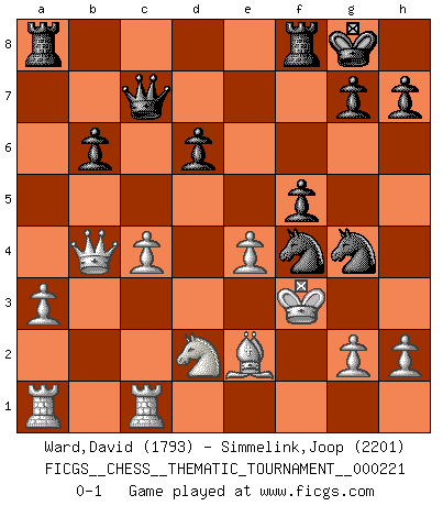 Last move : 0-1 2018 March 12 15:41:41 [Event "FICGS__CHESS__THEMATIC_TOURNAMENT__000221"] [Site "FICGS"] [Date "2017.12.14"] [Round "1"] [White "Ward,David"] [Black "Simmelink,Joop"] [Result "0-1"] [WhiteElo "1793"] [BlackElo "2201"] 1.e4 c5 2.Nf3 a6 3.c4 e6 4.Nc3 Qc7 5.Be2 b6 6.O-O Bb7 7.d4 cxd4 8.Qxd4 d6 9.Be3 Nd7 10.b4 Ngf6 11.Nd2 Be7 12.a3 a5 13.Nb5 Qb8 14.f4 O-O 15.Bf3 Bc6 16.Nc3 e5 17.Qd3 exf4 18.Bxf4 Ne5 19.Qd4 Nfd7 20.Nd5 Bxd5 21.Qxd5 Nf6 22.Qd4 Ne8 23.Qe3 Nc7 24.Be2 Ne6 25.Bg3 Bg5 26.Qc3 Qc7 27.Nf3 Bf4 28.Be1 axb4 29.Qxb4 Ng4 30.Bd2 Bxd2 31.Nxd2 Ne3 32.Rfc1 Nf4 33.Kf2 Ng4+ 34.Kf3 f5 0-1 Sicilian : O'Kelly variation Kingside Castling by player White (move 6) Kingside Castling by player Black (move 14) Player Black won this chess game. Follow this game move after move (download)For surely of all the drugs in the world, Chess must be the most permanently pleasurable. (Assiac) Die westlichen Werte sind eine Sprache, welche die Putin-Administration nicht versteht. (Garry Kasparov) En el Ajedrez, tal como en la vida, las bendiciones de hoy pueden ser el veneno del mañana. (Assaic) On peut tirer plus d'utilité d'une partie perdue que de 100 parties gagnées. (Capablanca) Computers have lots of memory but no imagination. (Anonymous)