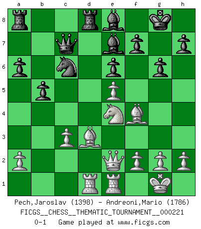 Last move : 0-1 2018 May 9 22:58:35 [Event "FICGS__CHESS__THEMATIC_TOURNAMENT__000221"] [Site "FICGS"] [Date "2017.12.14"] [Round "1"] [White "Pech,Jaroslav"] [Black "Andreoni,Mario"] [Result "0-1"] [WhiteElo "1398"] [BlackElo "1786"] 1.e4 c5 2.Nf3 a6 3.c3 Nf6 4.e5 Nd5 5.d4 cxd4 6.cxd4 d6 7.Bc4 e6 8.O-O Nc6 9.Qe2 Be7 10.Nc3 dxe5 11.dxe5 Nxc3 12.bxc3 O-O 13.Bd3 Qc7 14.Bf4 Rd8 15.Rad1 Bd7 16.Rfe1 Be8 17.Nd2 b5 18.Ne4 g6 0-1 This chess game has been lost on time (started : 2017.12.14 14:40:55) Sicilian : O'Kelly variation Kingside Castling by player White (move 8) Kingside Castling by player Black (move 12) Player Black won this chess game. Follow this game move after move (download)I don't believe in psychology. I believe in good moves. (Bobby Fischer) Glücklicherweise sind Großmeister Ruben Fines reine Schachbücher weniger phallozentrisch [als seine Schachpsychologie] und deswegen auch weniger lächerlich. (Nigel Short) Yo nunca en mi vida he jugado la Defensa Francesa, que viene siendo la más aburrida de todas las Aperturas. (Wilhelm Steinitz) Le profane ne songe pas à la somme de jouissance dont il se prive, qui méconnaît ce jeu aux ressources aussi variées que passionnantes. (Jean-Marie Jeanton-Lamarche) No enterprise is more likely to succeed than one concealed from the enemy until it is ripe for execution. (Niccolo Machiavelli)