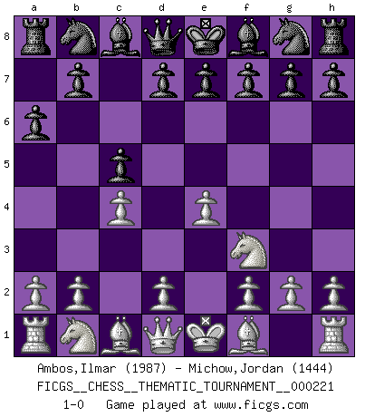Last move : 1-0 2018 January 23 23:52:30 [Event "FICGS__CHESS__THEMATIC_TOURNAMENT__000221"] [Site "FICGS"] [Date "2017.12.14"] [Round "1"] [White "Ambos,Ilmar"] [Black "Michow,Jordan"] [Result "1-0"] [WhiteElo "1987"] [BlackElo "1444"] 1.e4 c5 2.Nf3 a6 3.c4 1-0 This chess game has been lost on time (started : 2017.12.14 14:40:55) Sicilian : O'Kelly variation Player White won this chess game. Follow this game move after move (download)Chess is not like life... it has rules ! (Mark Pasternak) Ohne ihre Erfolge schmälern zu wollen würde ich sagen Petrosian, Spassky und Karpov verdanken ihre Siege ihren Trainern - Boleslavsky, Bondarevsky und Furman. (Mikhail Moiseyevich Botvinik) Del Ajedrez se ha dicho que la vida no es lo suficientemente larga para él, pero eso es culpa de la vida, no del Ajedrez. (William Ewart Napier) Un footballeur joue avec ses pieds, parfois avec sa tête. Un joueur d'échecs ne joue qu'avec sa tête. Et quand il ne joue plus, il meurt. (Jacob Murray) The ultimate in disposing one's troops is to be without ascertainable shape. Then the most penetrating spies cannot pry in nor can the wise lay plans against you. (Sun Tzu)
