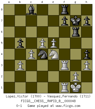 Last move : 0-1 2007 August 28 18:2:55 [Event "FICGS__CHESS__RAPID_B__000048"] [Site "FICGS"] [Date "2007.04.18"] [Round "1"] [White "Lopez,Victor"] [Black "Vasquez,Fernando"] [Result "0-1"] [WhiteElo "1700"] [BlackElo "1711"] 1.e4 e5 2.Bc4 Nf6 3.d3 Nc6 4.Nf3 Bc5 5.O-O d6 6.c3 O-O 7.h3 a6 8.Bb3 Ba7 9.Be3 Bxe3 10.fxe3 Nh5 11.Nxe5 Nxe5 12.Qxh5 Qe7 13.d4 Nd7 14.Nd2 a5 15.e5 a4 16.Bd5 Nb6 17.Be4 g6 18.exd6 Qxe4 19.Nxe4 gxh5 20.Nf6+ Kg7 21.dxc7 Ra5 22.e4 Na8 23.Rf3 Nxc7 24.Raf1 Rg5 25.b3 axb3 26.axb3 h4 27.e5 b5 28.Ne4 Rg6 29.c4 Ne6 30.d5 Nd4 0-1 This chess game has been lost on time (started : 2007.04.18 20:33:44) Bishop's Opening : Berlin defense Kingside Castling by player White (move 5) Kingside Castling by player Black (move 6) Player Black won this chess game. Follow this game move after move (download)Bobby Fischer is the greatest Chess genius of all time ! (Alexander Kotov) Alle Schachspieler sollten auch ein Hobby haben. (Savielly Grigorievitsch Tartakower) Las combinaciones han sido siempre el aspecto más intrigante del Ajedrez. Los Maestros las buscan, el público las aplauden, los críticos las alaban. La razón se debe a que las combinaciones hacen posible que el Ajedrez sea más que un ejercicio matemático con una carencia de vida. Ellas son la poesía del juego, son del Ajedrez lo que la melodía es de la música. Ellas representan el triunfo de la mente sobre la materia. (Reuben Fine) Ce qui caractérise les parties de combat, c'est que si le défenseur a constamment de difficiles problèmes à résoudre, l'attaquant doit chercher sans relâche de nouvelles possibilités d'attaque. (Koblentz) The various flowers seem good to different people. (Chinese proverb)