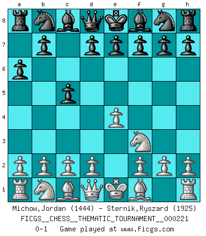 Last move : 0-1 2018 January 23 23:52:30 [Event "FICGS__CHESS__THEMATIC_TOURNAMENT__000221"] [Site "FICGS"] [Date "2017.12.14"] [Round "1"] [White "Michow,Jordan"] [Black "Sternik,Ryszard"] [Result "0-1"] [WhiteElo "1444"] [BlackElo "1925"] 1.e4 c5 2.Nf3 a6 0-1 This chess game has been lost on time (started : 2017.12.14 14:40:55) Sicilian : O'Kelly variation Player Black won this chess game. Follow this game move after move (download)No other master has such a terrific will to win. At the board he radiates danger, and even the strongest opponents tend to freeze, like rabbits when they smell a panther. Even his weaknesses are dangerous. As white, his opening game is predictable - you can make plans against it - but so strong that your plans almost never work. In the middle game his precision and invention are fabulous, and in the end game you simply cannot beat him. (Anonymous German Expert) Frage des Reporters: -Welche besonderen Umstände rechtfertigen das Anhalten der Uhren während einer Turnierpartie? Antwort: -Einen Fotographen zu strangulieren. (Siegbert Tarrasch) La captura del Rey enemigo es la finalidad pero no el primer objetivo de la partida. (William Steinitz) Le succès, c'est être capable d'aller d'échec en échec sans perdre son enthousiasme. (Winston Churchill) Art disturbs, science reassures. (Georges Braque, Le Jour et la Nuit)