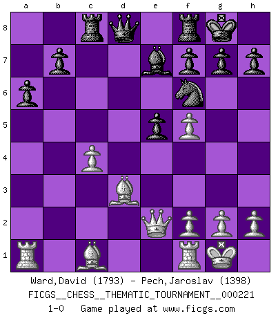 Last move : 1-0 2018 May 14 11:18:15 [Event "FICGS__CHESS__THEMATIC_TOURNAMENT__000221"] [Site "FICGS"] [Date "2017.12.14"] [Round "1"] [White "Ward,David"] [Black "Pech,Jaroslav"] [Result "1-0"] [WhiteElo "1793"] [BlackElo "1398"] 1.e4 c5 2.Nf3 a6 3.b4 cxb4 4.a3 e6 5.axb4 Bxb4 6.c3 Be7 7.d4 d6 8.Bd3 Nf6 9.O-O O-O 10.Qe2 Nc6 11.Na3 e5 12.Nc4 exd4 13.Nxd4 Ne5 14.Nxe5 dxe5 15.Nf5 Bxf5 16.exf5 Rc8 17.c4 1-0 This chess game has been lost on time (started : 2017.12.14 14:40:55) Sicilian : O'Kelly variation Kingside Castling by player White (move 9) Kingside Castling by player Black (move 9) Player White won this chess game. Follow this game move after move (download)We like to think. (Gary Kasparov) Später, ... hatte ich zunehmend Erfolg in entscheidenden Partien. Vielleicht weil ich eine einfache Wahrheit erkannte: nicht nur ich hatte Angst, auch mein Gegner. (Mikhail Nekhemyevich Tal) El Ajedrez se juega con la mente... ¡no con las manos!. (Renaud y Kahn) Horreur, mais aussi harmonie suprême : qu'y avait-il en effet au monde en dehors des échecs ? Le brouillard, l'inconnu, le non-être... (Vladimir Nabokov) The faster the computer, the slower the brain. (Thibault de Vassal)