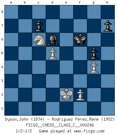 Last move : 1/2-1/2 2018 June 22 9:21:12 [Event "FICGS__CHESS__CLASS_C__000246"] [Site "FICGS"] [Date "2017.12.19"] [Round "1"] [White "Dyson,John"] [Black "Rodriguez Perez,Rene"] [Result "1/2-1/2"] [WhiteElo "1874"] [BlackElo "1952"] 1.Nf3 d5 2.g3 Nf6 3.Bg2 e6 4.O-O Be7 5.c4 O-O 6.d4 dxc4 7.Qc2 a6 8.a4 Bd7 9.Rd1 Bc6 10.Nc3 Bxf3 11.Bxf3 Nc6 12.Bxc6 bxc6 13.Bg5 Rb8 14.a5 Rb4 15.Na2 Rb5 16.Bxf6 Bxf6 17.Qxc4 Qd5 18.Rac1 Rxb2 19.Nb4 Qxa5 20.Nxc6 Qb5 21.e4 Re8 22.Rc2 Qxc4 23.Rxc4 g5 24.Kg2 Bg7 25.Ra4 Ra8 26.Rda1 Rb6 27.Rc1 Bf8 28.Na5 Rb4 29.Rxb4 Bxb4 30.Nc6 a5 31.Ra1 Bc3 32.Ra3 Bb2 33.Ra2 Ra6 34.d5 exd5 35.exd5 Bc3 36.Ra3 Bb2 37.Ra2 Bh8 38.Rxa5 Rxa5 39.Nxa5 Bd4 40.Kf3 f5 41.Nc6 Bc5 42.h3 Kf7 43.g4 Kf6 44.Ke2 fxg4 45.hxg4 Bd6 1/2-1/2 Reti : King's Indian attack (Barcza system) Kingside Castling by player White (move 4) Kingside Castling by player Black (move 5) 10 pieces endgame at move 45 : White KNPPP , Black KBPPP WHITE : King + 1 Knight 3 Pawns BLACK : King + 1 Bishop 3 Pawns This chess game ended in a draw. Follow this game move after move (download)Combinations have always been the most intriguing aspect of Chess. The masters look for them, the public applauds them, the critics praise them. It is because combinations are possible that Chess is more than a lifeless mathematical exercise. They are the poetry of the game; they are to Chess what melody is to music. They represent the triumph of mind over matter. (Reuben Fine) Gegen einen Schachcomputer zu verlieren ist wie Löcher in den Strümpfen zuhaben. Es ist nicht peinlich, solange man der einzige ist der es weiß. (Anonymous) El Ajedrez es tan interesante por sí solo, que no es necesario un interés monetario para persuadir a una persona a que lo practique; por lo tanto, nunca se juega por dinero. (Benjamin Franklin) On peut tirer plus d'utilité d'une partie perdue que de 100 parties gagnées. (Capablanca) I don't diet. I just don't eat as much as I'd like to. (Linda Evangelista, supermodel)