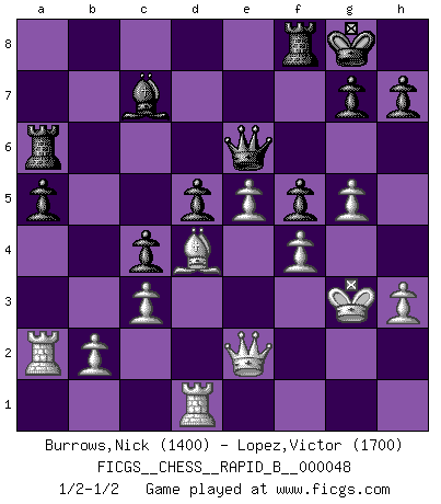 Last move : 1/2-1/2 2007 June 6 10:16:20 [Event "FICGS__CHESS__RAPID_B__000048"] [Site "FICGS"] [Date "2007.04.18"] [Round "1"] [White "Burrows,Nick"] [Black "Lopez,Victor"] [Result "1/2-1/2"] [WhiteElo "1400"] [BlackElo "1700"] 1.e4 e5 2.Nf3 Nc6 3.Bb5 a6 4.Ba4 Nf6 5.O-O Nxe4 6.d4 b5 7.Bb3 d5 8.dxe5 Be6 9.Nbd2 Nc5 10.c3 Nxb3 11.Nxb3 Be7 12.Nfd4 Qd7 13.Nxc6 Qxc6 14.Be3 O-O 15.f4 f5 16.Nd4 Qd7 17.Qe2 c5 18.Nxe6 Qxe6 19.a4 Rab8 20.axb5 Rxb5 21.Rfd1 c4 22.Ra2 Ra8 23.Rda1 R5b8 24.h3 Bd8 25.Kh2 Bc7 26.Rd1 a5 27.Bd4 Rd8 28.g4 Ra6 29.Kg3 Rf8 30.g5 1/2-1/2 Ruy Lopez : Open, 7.Bb3 Kingside Castling by player White (move 5) Kingside Castling by player Black (move 14) This chess game ended in a draw. Follow this game move after move (download)Chess is above all, a fight ! (Emanuel Lasker) Man kann eine Schachpartie nur gewinnen, wenn das Gleichgewicht gestört ist. In einer Stellung mit ungestörtem Gleichgewicht ist auch das größte Genie hilflos - in der Stellung steckt dann eben kein genialer Einfall. (Wilhelm Steinitz) Nunca antes ha habido un jugador de Ajedrez con tal conocimiento a fondo de las complejidades del juego y una inmensa voluntad absolutamente indomable de ganar. Yo pienso que Fischer es el jugador mas grande que jamás haya existido. (Lisa Lane) Les Cavaliers se révèlent fort utiles dans les positions fermées. D'habitude, les Fous sont un peu plus forts que les Cavaliers dans les positions ouvertes. Qu'on le veuille ou non, il restera toujours des exceptions ! Logic : The art of thinking and reasoning in strict accordance with the limitations and incapacities of the human misunderstanding. (Ambrose Bierce)