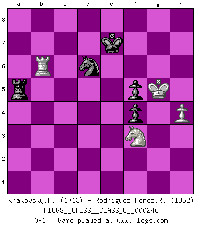 Last move : 0-1 2018 August 8 9:52:43 [Event "FICGS__CHESS__CLASS_C__000246"] [Site "FICGS"] [Date "2017.12.19"] [Round "1"] [White "Krakovsky,Peter"] [Black "Rodriguez Perez,Rene"] [Result "0-1"] [WhiteElo "1713"] [BlackElo "1952"] 1.d4 d5 2.c4 e6 3.Nc3 Nf6 4.Nf3 Be7 5.Bf4 O-O 6.e3 Nbd7 7.c5 Nh5 8.Bd3 Nxf4 9.exf4 b6 10.b4 a5 11.a3 c6 12.O-O Qc7 13.g3 Ba6 14.Bxa6 Rxa6 15.Qe2 Rfa8 16.b5 cxb5 17.Nxd5 exd5 18.Qxe7 Rc8 19.Rfb1 bxc5 20.Rxb5 Re6 21.Qg5 h6 22.Qxd5 Rd6 23.Qc4 cxd4 24.Qxc7 Rxc7 25.Rxa5 d3 26.Rd1 Kh7 27.Nd2 Rc2 28.Kg2 Re6 29.Rd5 Nc5 30.Nf3 R6e2 31.Rd2 Ne4 32.Rxe2 Rxe2 33.Rxd3 Rxf2+ 34.Kh3 f5 35.Kh4 Kg6 36.h3 Kf6 37.Rb3 g5+ 38.Kh5 Nxg3+ 39.Kxh6 gxf4 40.h4 Ne4 41.a4 Nd6 42.a5 Ra2 43.Rb6 Ke7 44.Kg5 Rxa5 0-1 QGD : Classical variation (5.Bf4) Kingside Castling by player Black (move 5) Kingside Castling by player White (move 12) 10 pieces endgame at move 39 : White KRNPP , Black KRNPP WHITE : King + 1 Rook 1 Knight 2 Pawns BLACK : King + 1 Rook 1 Knight 2 Pawns 9 pieces endgame at move 44 : White KRNP , Black KRNPP WHITE : King + 1 Rook 1 Knight 1 Pawn BLACK : King + 1 Rook 1 Knight 2 Pawns Player Black won this chess game. Follow this game move after move (download)A sacrifice is best refuted by accepting it. (Wilhelm Steinitz) Ich kenne keine einzige Person, die behaupten würde, Garri Kasparow sei ein guter Mensch (Nigel Short) Un Peón pasado aumenta su poder a medida de que el número de piezas en el tablero disminuye. (Capablanca) Même si l'adversaire joue le coup analysé précédemment, recommencez l'analyse en voyant la nouvelle position. Première règle de Blumenfeld The hypothalamus is one of the most important parts of the brain, involved in many kinds of motivation, among other functions. The hypothalamus controls the 'Four Fs: Fighting, Fleeing, Feeding and Mating. (Unknown author)