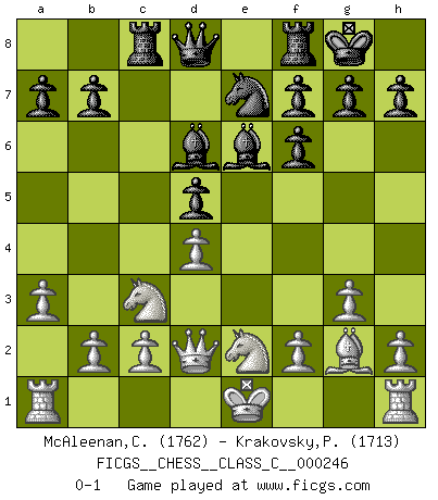 Last move : 0-1 2018 April 16 9:3:50 [Event "FICGS__CHESS__CLASS_C__000246"] [Site "FICGS"] [Date "2017.12.19"] [Round "1"] [White "McAleenan,Charles"] [Black "Krakovsky,Peter"] [Result "0-1"] [WhiteElo "1762"] [BlackElo "1713"] 1.d4 Nf6 2.Nc3 d5 3.Bg5 c5 4.Bxf6 exf6 5.e3 Nc6 6.Nge2 Be6 7.g3 cxd4 8.exd4 Bd6 9.Bg2 Ne7 10.Qd2 Rc8 11.a3 O-O 0-1 This chess game has been lost on time (started : 2017.12.19 7:34:38) Queen's pawn game Kingside Castling by player Black (move 11) Player Black won this chess game. Follow this game move after move (download)Every Pawn is a potential Queen. (James Mason) Ein Schachspiel besteht aus drei Phasen: Die erste, wenn du hofftst den Vorteil zu haben, die zweite, wenn du glaubst einen Vorteil zu haben, und die dritte.... wenn du weißt Du wirst verlieren. (Savielly Grigorievitsch Tartakower) El Ajedrez es tortura mental. (Garry Kasparov) Je fais ceci parce que dans cinquante coups j'obtiendrai cela; je m'appelle Mikhail Moisevitch Botvinnik. (Botvinnik) I live to kill Traxler counterattack. (Ilmars Cirulis)