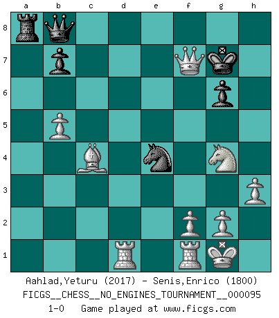 Last move : 1-0 2018 May 17 18:37:22 [Event "FICGS__CHESS__NO_ENGINES_TOURNAMENT__000095"] [Site "FICGS"] [Date "2017.12.19"] [Round "1"] [White "Aahlad,Yeturu"] [Black "Senis,Enrico"] [Result "1-0"] [WhiteElo "2017"] [BlackElo "1800"] 1.c4 Nf6 2.d4 g6 3.Nf3 Bg7 4.Nc3 d6 5.e4 O-O 6.Be2 e5 7.d5 h6 8.Be3 Bg4 9.h3 Bd7 10.O-O c6 11.Qd2 Nh7 12.Bxh6 Re8 13.Bxg7 Kxg7 14.dxc6 Bxc6 15.b4 a6 16.Rad1 Re6 17.c5 Qc7 18.cxd6 Qd7 19.Bc4 Rf6 20.Nxe5 Qd8 21.Ng4 Rxd6 22.Qxd6 Nd7 23.a4 Nhf6 24.b5 axb5 25.axb5 Bxe4 26.Nxe4 Nxe4 27.Qxd7 Qb8 28.Qxf7+ 1-0 English, 1...Nf6 (Anglo-Indian defense) Kingside Castling by player Black (move 5) Kingside Castling by player White (move 10) Player White won this chess game. Follow this game move after move (download)Chess holds its master in its own bonds, shackling the mind and brain so that the inner freedom of the very strongest must suffer. (Albert Einstein) Kleine Schachspieler machen Mist, und große Schachspieler machen Mist, aber große machen weniger Mist. (Fritz Sämisch) Preferería tener un Peón que un dedo. (Reuben Fine) Le jeu d'échecs est comme rejeté hors du temps. (Antoine de Saint-Exupéry) When you stop learning you start dying. (Scott Adams)