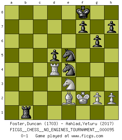 Last move : 0-1 2018 July 23 21:9:16 [Event "FICGS__CHESS__NO_ENGINES_TOURNAMENT__000095"] [Site "FICGS"] [Date "2017.12.19"] [Round "1"] [White "Foster,Duncan"] [Black "Aahlad,Yeturu"] [Result "0-1"] [WhiteElo "1703"] [BlackElo "2017"] 1.e4 c5 2.a3 Nc6 3.b4 cxb4 4.axb4 Nxb4 5.d4 e6 6.c3 Nc6 7.d5 exd5 8.exd5 Ne5 9.f4 Ng6 10.Qe2+ Qe7 11.Na3 Qxe2+ 12.Bxe2 a6 13.Nc4 Bc5 14.Ba3 Bxa3 15.Rxa3 Nxf4 16.Bf3 b5 17.Nd6+ Ke7 18.Nxc8+ Rxc8 19.Kd2 Nf6 20.Ne2 N4xd5 21.Rxa6 Rc5 22.Nd4 Rb8 23.Rc1 b4 24.cxb4 Rxc1 25.Kxc1 Nxb4 26.Nf5+ Kf8 27.Ra4 g6 28.Ne3 Nd3+ 29.Kd2 Ne5 30.Be2 Rb2+ 31.Ke1 d5 32.Rd4 Rb1+ 33.Kf2 Ne4+ 0-1 Sicilian defense Player Black won this chess game. Follow this game move after move (download)We must make sure that Chess will not be like a dead language, very interesting, but for a very small group. (Sytze Faber) Vielleicht wirkt die Aura früherer Spieler glanzvoller als die der heutigen Spieler, aber das liegt daran, dass man kein Programm wie Fritz hatte, das einem all die Löcher in ihren Partien zeigt. (Vladimir Kramnik) Debió haber existido una vez en que los hombres eran semidióses, de otra manera no hubiesen podido inventar el Ajedrez. (Gustav Schenk) On peut tirer plus d'utilité d'une partie perdue que de 100 parties gagnées. (Capablanca) Without deviation from the norm, progress is not possible. (Frank Zappa)