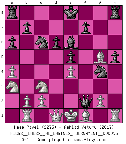 Last move : 0-1 2018 March 29 0:4:20 [Event "FICGS__CHESS__NO_ENGINES_TOURNAMENT__000095"] [Site "FICGS"] [Date "2017.12.19"] [Round "1"] [White "Hase,Pavel"] [Black "Aahlad,Yeturu"] [Result "0-1"] [WhiteElo "2275"] [BlackElo "2017"] 1.e4 c5 2.Nf3 Nc6 3.d4 cxd4 4.Nxd4 Nf6 5.Nc3 e5 6.Ndb5 d6 7.a4 a6 8.Na3 Be6 9.Bg5 Qb6 10.Rb1 Ng4 11.Qd2 h6 12.Bh4 g5 13.Bg3 h5 14.h4 gxh4 15.Bxh4 Bh6 16.Qd1 Bg5 17.Bxg5 Qxf2+ 0-1 Sicilian : Pelikan (Lasker/Sveshnikov) variation Player Black won this chess game. Follow this game move after move (download)We must make sure that Chess will not be like a dead language, very interesting, but for a very small group. (Sytze Faber) Wenn ich einen Club besuche, sind die Spieler stumm vor Staunen. (José Raúl Capablanca) El Ajedrez es la vida. (Bobby Fischer) Des points faibles ou des trous dans la position de l'adversaire doivent être occupés par des pièces et non pas par des pions. (Siegbert Tarrasch) The leaves of memory seemed to make a mournful rustling in the dark. (Henry Wadsworth Longfellow)