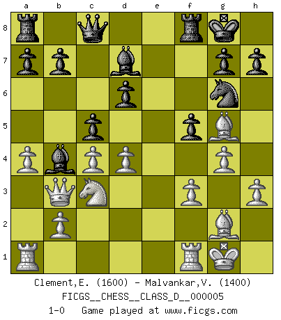 Last move : 1-0 2006 September 15 7:6:27 [Event "FICGS__CHESS__CLASS_D__000005"] [Site "FICGS"] [Date "2006.06.01"] [Round "1"] [White "Clement,Etienne"] [Black "Malvankar,Vikrant"] [Result "1-0"] [WhiteElo "1600"] [BlackElo "1400"] 1.c4 e5 2.Nc3 Nc6 3.g3 Bc5 4.e3 Nge7 5.Bg2 O-O 6.Nge2 d6 7.d4 exd4 8.exd4 Bb6 9.O-O Bf5 10.h3 Qc8 11.g4 Bd7 12.Bg5 Ng6 13.a4 Ba5 14.Nd5 f5 15.f3 Nb4 16.Nxb4 Bxb4 17.Qb3 c5 18.Nc3 1-0 This chess game has been lost on time (started : 2006.06.01 14:40:57) English : Sicilian Reversed Kingside Castling by player Black (move 5) Kingside Castling by player White (move 9) Player White won this chess game. Follow this game move after move (download)The enormous mental resilience, without which no Chess player can exist, was so much taken up by Chess that he could never free his mind of this game. (Albert Einstein) Das Schach ist nichts für kleine Geister, es beansprucht einen vollen Mann, der sich nicht sklavisch an das Überlieferte hält, sondern selbständig die Tiefen des Spiels zu ergründen sucht. (Wilhelm Steinitz) El Ajedrez es un juego terrible. Si no dominas el centro, tu oponente tiene una posición mas libre. Si tu tienes el centro, entonces realmente tienes algo de que preocuparte. (Siegbert Tarrasch) Celui qui prend des risques peut perdre, celui qui n'en prend pas perd toujours. (Xavier Tartacover) It's not a bug - it's an undocumented feature. (Anonymous)