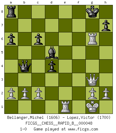 Last move : 1-0 2007 July 21 16:8:44 [Event "FICGS__CHESS__RAPID_B__000048"] [Site "FICGS"] [Date "2007.04.18"] [Round "1"] [White "Bellanger,Michel"] [Black "Lopez,Victor"] [Result "1-0"] [WhiteElo "1606"] [BlackElo "1700"] 1.e4 c5 2.Nf3 d6 3.d4 cxd4 4.Nxd4 Nf6 5.Nc3 a6 6.Be2 e5 7.Nb3 Be6 8.O-O Be7 9.f4 exf4 10.Bxf4 Nc6 11.Qe1 d5 12.Qg3 d4 13.Nd5 Nxd5 14.exd5 Qxd5 15.Bf3 Qc4 16.Nd2 Qb4 17.Rae1 g6 18.Bxc6+ bxc6 19.Ne4 O-O 20.Bg5 f6 21.Bxf6 Bxf6 22.Nxf6+ Rxf6 23.Rxf6 Bd5 24.Rxg6+ 1-0 Sicilian : Najdorf, Opovcensky variation Kingside Castling by player White (move 8) Kingside Castling by player Black (move 19) Player White won this chess game. Follow this game move after move (download)The battle for the ultimate truth will never be won. And that's why Chess is so fascinating. (Hans Kmoch) Bobby Fischer ist kein Vorbild für die heutige Jugend. (Viktor Kortschnoi) Robert Fischer es la ley hacia si mismo. (Larry Evans) Botvinnik disait en comparant les échecs à la musique: Il existe une science dont le but est l'étude de l'acoustique et des sons. Mais il y a aussi un art qui se sert de l'océan des sons : c'est la musique. De toute évidence, il en est de même pour la pensée. La logique est l'étude des lois de la réflexion et les échecs reflètent, en tant qu'art, le côté logique de la réflexion, sous la forme d'images artistiques... Extrait de Fischer - Spassky, Reykjavik 1972 par Alexander & F. Wyndham (Ed. Solar), p 37. The beginning is the most important part of the work. (Plato)