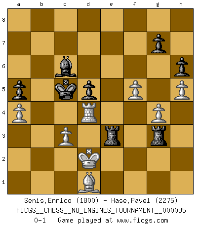 Last move : 0-1 2018 March 11 15:45:14 [Event "FICGS__CHESS__NO_ENGINES_TOURNAMENT__000095"] [Site "FICGS"] [Date "2017.12.19"] [Round "1"] [White "Senis,Enrico"] [Black "Hase,Pavel"] [Result "0-1"] [WhiteElo "1800"] [BlackElo "2275"] 1.d4 d5 2.Nf3 Nc6 3.c3 Bg4 4.Bf4 f6 5.e3 e5 6.dxe5 fxe5 7.Bg3 e4 8.h3 Bh5 9.Bh4 Bxf3 10.Bxd8 Bxd1 11.Bxc7 Bh5 12.Bb5 Kd7 13.Bg3 Bd6 14.Nd2 Nge7 15.Bh4 Nf5 16.Bg5 h6 17.Bf4 Bxf4 18.exf4 Nd6 19.Ba4 b5 20.Bb3 Bf7 21.O-O-O Kc7 22.Rhe1 Nc4 23.Nxc4 bxc4 24.Bc2 Rhe8 25.g4 Re7 26.b3 cxb3 27.Bxb3 Rd8 28.f5 Ne5 29.Rd2 Nf3 30.Rde2 Nxe1 31.Rxe1 Be8 32.Rd1 Bc6 33.a4 a5 34.Kc2 e3 35.fxe3 Rxe3 36.h4 Rg3 37.Rd4 Rd7 38.h5 Kb6 39.Kd2 Kc5 40.Bc2 Re7 41.Bd1 R7e3 0-1 Queen's pawn game, Chigorin variation Queenside Castling by player White (move 21) Player Black won this chess game. Follow this game move after move (download)Nowadays, when you're not a grandmaster at 14, you can forget about it. (Anand Viswanathan) Ich erzeugte keinen Neid, da mich die Schachspieler als Musiker und die Musiker als Schachspieler betrachteten. (Mark Taimanov) El Ajedrez hace al hombre ser mas sabio y ver mas claro. (Vladimir Putin) Même un GMI sait rarement calculer sur plus de cinq coups une attaque à sacrifices. (Rudolf Spielmann) Luck has a peculiar habit of favoring those who don't depend on it. (Author unknown)