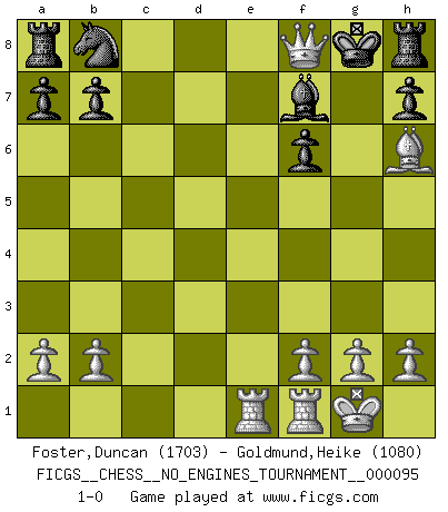 Last move : 1-0 2018 March 8 18:37:59 [Event "FICGS__CHESS__NO_ENGINES_TOURNAMENT__000095"] [Site "FICGS"] [Date "2017.12.19"] [Round "1"] [White "Foster,Duncan"] [Black "Goldmund,Heike"] [Result "1-0"] [WhiteElo "1703"] [BlackElo "1080"] 1.e4 d5 2.exd5 Qxd5 3.Nc3 Qa5 4.d4 Nf6 5.Nf3 Bf5 6.Bc4 e6 7.Bd2 c6 8.Ne4 Qc7 9.Nxf6+ gxf6 10.Qe2 Bxc2 11.O-O Bg6 12.Rac1 Bd6 13.d5 Ke7 14.dxe6 Be5 15.Nxe5 Qxe5 16.Qf3 fxe6 17.Rce1 Qf5 18.Qa3+ c5 19.Bxe6 Qc2 20.Bf5 Kf7 21.Bxc2 Bxc2 22.Qxc5 Bg6 23.Qe7+ Kg8 24.Bh6 Bf7 25.Qf8+ 1-0 Scandinavian defense Kingside Castling by player White (move 11) Player White won this chess game. Follow this game move after move (download)Man is a frivolous, a specious creature, and like a Chess player, cares more for the process of attaining his goal than for the goal itself. (Dostoyevsky) Ich trinke, ich rauche, ich spiele, ich liebe Frauen aber Fernschach ist ein Laster, das ich nicht habe. (Mikhail Nekhemyevich Tal) ¿Quién es tu oponente esta tarde? Esta tarde mi oponente son las piezas negras. (Akiba Rubinstein) En blitz, le Cavalier l'emporte sur le Fou. (Vlastimil Hort) 98% of all statistics are made up. (Author unknown)