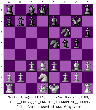 Last move : 0-1 2018 March 3 11:15:57 [Event "FICGS__CHESS__NO_ENGINES_TOURNAMENT__000095"] [Site "FICGS"] [Date "2017.12.19"] [Round "1"] [White "Niglio,Biagio"] [Black "Foster,Duncan"] [Result "0-1"] [WhiteElo "1305"] [BlackElo "1703"] 1.d4 f5 2.Nf3 Nf6 3.Bf4 d6 4.e3 h6 5.Bd3 e6 6.Nbd2 Be7 7.c3 Nc6 8.Nh4 Kf7 9.Nhf3 g5 10.Bg3 Kg7 11.h3 e5 12.dxe5 dxe5 13.Nxe5 Nxe5 0-1 Dutch Player Black won this chess game. Follow this game move after move (download)First-class players lose to second-class players because second-class players sometimes play a first-class game. (Siegbert Tarrasch) Die Fehler sind da, Sie warten nur darauf gemacht zu werden. (Savielly Grigorievitsch Tartakower) No puedes jugar al Ajedrez si eres de corazón noble. (Proverbio Francés) Je ne suis pas le dernier à jouer lâchement des coups douteux pendant le zeïtnot de l'adversaire pour l'achever: en effet les coups qui font le plus peur sont ceux que l'on ne comprend pas. Je me fais souvent peur quand je joue. (Un professeur anonyme) Life is like a game of cards: the hand you are dealt represents determinism; the way you play it is free will. (Jawaharlal Nehru)