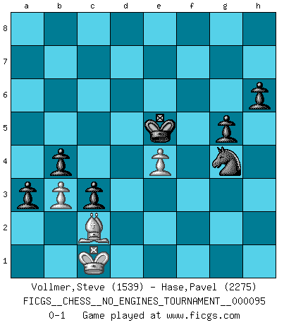 Last move : 0-1 2018 March 20 0:42:8 [Event "FICGS__CHESS__NO_ENGINES_TOURNAMENT__000095"] [Site "FICGS"] [Date "2017.12.19"] [Round "1"] [White "Vollmer,Steve"] [Black "Hase,Pavel"] [Result "0-1"] [WhiteElo "1539"] [BlackElo "2275"] 1.d4 d5 2.c4 Nc6 3.e3 e5 4.dxe5 dxc4 5.Qxd8+ Kxd8 6.Nf3 Be6 7.Nc3 Bb4 8.Bd2 Nge7 9.Rd1 a6 10.Be2 h6 11.O-O Ng6 12.Ne4 Bxd2 13.Rxd2+ Ke7 14.Nc5 b5 15.Nxe6 fxe6 16.Rfd1 Rhd8 17.Nd4 Ngxe5 18.Nxc6+ Nxc6 19.Bf3 Rxd2 20.Rxd2 Rd8 21.Rxd8 Nxd8 22.Kf1 Kd6 23.Ke2 c5 24.Be4 a5 25.Kd2 Nc6 26.h3 b4 27.g4 Ne7 28.b3 c3+ 29.Kd3 Nd5 30.Bg2 Nb6 31.Be4 a4 32.Kc2 c4 33.Bf3 Kc5 34.Be2 e5 35.Bf1 cxb3+ 36.axb3 a3 37.Kb1 e4 38.Be2 Nd7 39.f3 exf3 40.Bxf3 Kd6 41.Be4 Ke5 42.Bc2 g5 43.Bd3 Nc5 44.Bc2 Ne4 45.Bd3 Nf2 46.Bc2 Nxh3 47.e4 Nf2 48.Kc1 Nxg4 0-1 QGD : Chigorin defense Kingside Castling by player White (move 11) Player Black won this chess game. Follow this game move after move (download)In Chess, as it is played by masters, chance is practically eliminated. (Emanuel Lasker) Mein Gehirn das ist mein zweitwichtigstes Organ [Aus dem Film: Der Schläfer]. (Woody Allen) Las piezas de Ajedrez son los bloques del alfabeto que moldean los pensamientos; y esos pensamientos, aunque hagan un diseño visual en el tablero, expresan abstractamente su belleza como un poema. (Marcel Duchamp) Le succès, c'est être capable d'aller d'échec en échec sans perdre son enthousiasme. (Winston Churchill) A woman without a man is like a fish without a bicycle. (Gloria Steinem)