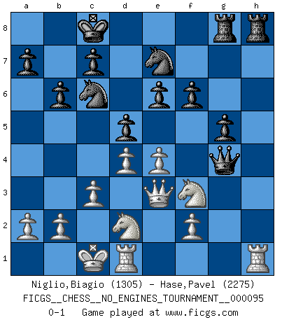 Last move : 0-1 2018 March 31 17:55:25 [Event "FICGS__CHESS__NO_ENGINES_TOURNAMENT__000095"] [Site "FICGS"] [Date "2017.12.19"] [Round "1"] [White "Niglio,Biagio"] [Black "Hase,Pavel"] [Result "0-1"] [WhiteElo "1305"] [BlackElo "2275"] 1.d4 d5 2.Nf3 Nc6 3.Bf4 Bg4 4.e3 Qd7 5.h3 Bf5 6.Bd3 O-O-O 7.c3 f6 8.Qc2 Bxd3 9.Qxd3 e6 10.Nbd2 g5 11.Bh2 Bd6 12.Bxd6 Qxd6 13.O-O-O Nge7 14.g4 h5 15.Nb3 b6 16.Nbd2 Rdg8 17.e4 Qf4 18.Qe3 hxg4 19.hxg4 Qxg4 0-1 Queen's pawn game, Chigorin variation Queenside Castling by player Black (move 6) Queenside Castling by player White (move 13) Player Black won this chess game. Follow this game move after move (download)The essence of Chess is thinking about what Chess is. (David Bronstein) Herr Iljumschinow ist ein etwas merkwürdiger Geschäftsmann: Er arbeitet zusammen mit Leuten wie Muammar al-Gaddafi; früher ist das Saddam Hussein gewesen. (Joel Lautier) El Jaque al descubierto es el bombardero del tablero. (Reuben Fine) On est toujours la mazette de quelqu'un d'autre. (Anonyme) There are two kinds of people in the world, my friend. Those who have a loaded gun and those who dig. You dig ! (Blondie in The Good, The Bad and The Ugly)