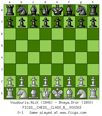 Last move : 0-1 2018 May 13 23:16:53 [Event "FICGS__CHESS__CLASS_B__000263"] [Site "FICGS"] [Date "2018.04.03"] [Round "1"] [White "Voudouris,Nick"] [Black "Bnaya,Dror"] [Result "0-1"] [WhiteElo "1846"] [BlackElo "1800"] 0-1 This chess game has been lost on time (started : 2018.04.03 15:29:7) Player Black won this chess game. Follow this game move after move (download)Fischer was a master of clarity and a king of artful positioning. His opponents would see where he was going but were powerless to stop him. (Bruce Pandolfini) Es gibt Leute, die glauben, alles wäre vernünftig, was man mit einem ernsthaften Gesicht tut. (Georg Christoph Lichtenberg) Cuando tengas duda... ¡juega al Ajedrez!. (Tevis) Même un GMI sait rarement calculer sur plus de cinq coups une attaque à sacrifices. (Rudolf Spielmann) Heh, heh, heh. Time to abandon ship. (General Grievous in Star Wars ep.3)