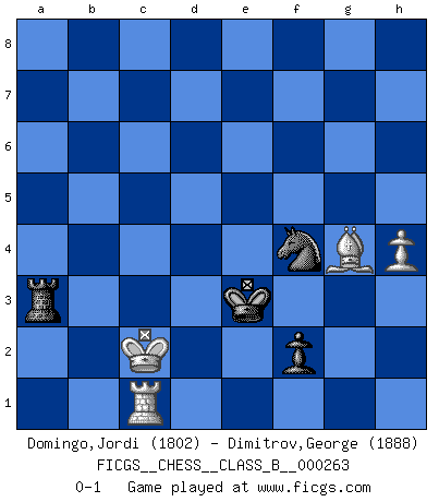 Last move : 0-1 2018 December 25 10:52:39 [Event "FICGS__CHESS__CLASS_B__000263"] [Site "FICGS"] [Date "2017.12.20"] [Round "1"] [White "Domingo,Jordi"] [Black "Dimitrov,George"] [Result "0-1"] [WhiteElo "1802"] [BlackElo "1888"] 1.e4 c6 2.d4 d5 3.e5 Bf5 4.h4 h5 5.c4 e6 6.Nc3 Ne7 7.Bg5 dxc4 8.Bxc4 Nd7 9.Nge2 f6 10.exf6 gxf6 11.Be3 Nb6 12.Bb3 Ned5 13.Ng3 Nxe3 14.fxe3 Bg4 15.Qd3 f5 16.e4 f4 17.Nge2 Bh6 18.Ng1 Qe7 19.Nf3 O-O-O 20.O-O-O Kb8 21.Kb1 Bg7 22.Qf1 Rhf8 23.Qf2 Qb4 24.e5 a5 25.Qe1 Bxf3 26.gxf3 Rxd4 27.Rg1 Rxd1+ 28.Bxd1 Bh8 29.Rg5 Rd8 30.a3 Qd4 31.Bb3 Nd7 32.Qd1 Qxd1+ 33.Bxd1 Nxe5 34.Be2 Nf7 35.Rxh5 Rd2 36.Bc4 Bd4 37.Bxe6 Ne5 38.Rh8+ Ka7 39.Rh7 Bxc3 40.bxc3 Rh2 41.Kc1 Nxf3 42.Bc8 Kb6 43.Rxb7+ Kc5 44.Ra7 Kc4 45.Rxa5 Kb3 46.Be6+ Kxc3 47.Rc5+ Kd4 48.Rxc6 Ne5 49.Rc2 Rh1+ 50.Kb2 Nd3+ 51.Ka2 f3 52.Bf5 Ke3 53.Rc3 Rd1 54.Bg4 Rd2+ 55.Kb3 f2 56.Bh3 Ke2 57.Rc8 Nf4 58.Bg4+ Ke3 59.Rc1 Rd3+ 60.Kc2 Rxa3 0-1 Caro-Kann : Advance variation Queenside Castling by player Black (move 19) Queenside Castling by player White (move 20) 10 pieces endgame at move 46 : White KRBPP , Black KRNPP WHITE : King + 1 Rook 1 Bishop 2 Pawns BLACK : King + 1 Rook 1 Knight 2 Pawns 9 pieces endgame at move 48 : White KRBPP , Black KRNP WHITE : King + 1 Rook 1 Bishop 2 Pawns BLACK : King + 1 Rook 1 Knight 1 Pawn 8 pieces endgame at move 60 : White KRBP , Black KRNP WHITE : King + 1 Rook 1 Bishop 1 Pawn BLACK : King + 1 Rook 1 Knight 1 Pawn Player Black won this chess game. Follow this game move after move (download)Live, lose, and learn, by observing your opponent how to win. (Amber Steenbock) Wenn ich einen Club besuche, sind die Spieler stumm vor Staunen. (José Raúl Capablanca) El Ajedrez es una hermosa aventura. (Bent Larsen) Il vaut mieux sacrifier les pièces de l'adversaire. (Xavier Tartacover) To steal ideas from one person is plagiarism. To steal from many is research. (Unknown)