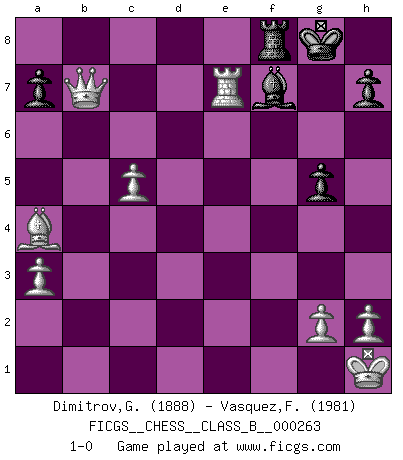 Last move : 1-0 2018 September 2 21:50:7 [Event "FICGS__CHESS__CLASS_B__000263"] [Site "FICGS"] [Date "2017.12.20"] [Round "1"] [White "Dimitrov,George"] [Black "Vasquez,Fernando"] [Result "1-0"] [WhiteElo "1888"] [BlackElo "1981"] 1.e4 e5 2.Nf3 Nf6 3.Nxe5 d6 4.Nf3 Nxe4 5.d4 d5 6.Bd3 Be7 7.O-O Nc6 8.c4 Nb4 9.Be2 O-O 10.Nc3 Be6 11.Ne5 f6 12.Nf3 Kh8 13.cxd5 Nxc3 14.bxc3 Nxd5 15.Qc2 c5 16.Rb1 Qd7 17.Re1 cxd4 18.Nxd4 Bf7 19.Bd3 g6 20.Bb5 Qc7 21.c4 Nb4 22.Qe4 Bc5 23.a3 Nc6 24.Bf4 Ne5 25.Ba4 Bb6 26.Nf3 g5 27.Nxe5 fxe5 28.Bxe5+ Kg8 29.Bxc7 Bxf2+ 30.Kh1 Bxe1 31.Rxe1 Bg6 32.Qxb7 Bf7 33.c5 Rac8 34.Bd6 Rcd8 35.Bxf8 Rxf8 36.Re7 1-0 Petrov : Classical attack Kingside Castling by player White (move 7) Kingside Castling by player Black (move 9) Player White won this chess game. Follow this game move after move (download)Even the laziest King flees wildly in the face of a double check ! (Aaron Nimzowitsch) Du musst nicht gut spielen, es reicht, wenn du besser spielst als dein Gegner. (Anonymous) El Ajedrez por encima de todo... ¡es una pelea!. (Emanuel Lasker) Je ne suis pas le dernier à jouer lâchement des coups douteux pendant le zeïtnot de l'adversaire pour l'achever: en effet les coups qui font le plus peur sont ceux que l'on ne comprend pas. Je me fais souvent peur quand je joue. (Un professeur anonyme) Live, lose, and learn, by observing your opponent how to win. (Amber Steenbock)