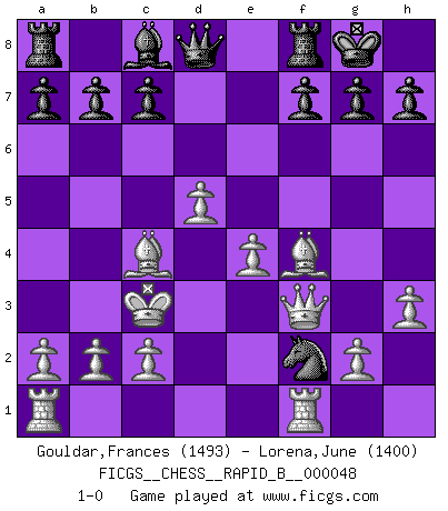 Last move : 1-0 2007 June 11 13:6:27 [Event "FICGS__CHESS__RAPID_B__000048"] [Site "FICGS"] [Date "2007.04.18"] [Round "1"] [White "Gouldar,Frances"] [Black "Lorena,June"] [Result "1-0"] [WhiteElo "1493"] [BlackElo "1400"] 1.e4 e5 2.f4 Nc6 3.Nf3 exf4 4.Bc4 d6 5.d4 Be7 6.Bxf4 Nf6 7.Nc3 O-O 8.d5 Ne5 9.Nxe5 dxe5 10.Bxe5 Bc5 11.Qf3 Ng4 12.Bf4 Bf2+ 13.Kd2 Bd4 14.h3 Nf2 15.Rhf1 Bxc3+ 16.Kxc3 1-0 This chess game has been lost on time (started : 2007.04.18 20:33:44) King's gambit Kingside Castling by player Black (move 7) Player White won this chess game. Follow this game move after move (download)Of all my Russian books, the defense contains and diffuses the greatest 'warmth' which may seem odd seeing how supremely abstract Chess is supposed to be. (Vladimir Nabokov) Die Auseinandersetzung mit Karpow war politisch geprägt. Er stand für das kommunistische System, wurde von dessen Repräsentanten gehätschelt. Ich war der Oppositionelle. Jeder Schachweltmeister spiegelt auch die gesellschaftlichen Verhältnisse wider. Kramnik steht für die Börsen-Generation des Neuen Markts, ideologiefrei, zahlenfixiert. (Garry Kasparov) Hay dos clases de hombres: aquellos que se conforman en dejarse llevar por las circunstancias y que juegan barajas y aquellos decididos a controlar las circunstancias y que juegan al Ajedrez. (Mortimer Collins) Plusieurs personnes se sont demandées comment Tal faisait pour gagner... En fait, c'est très simple ! Il met ses pièces au centre de l'échiquier et les sacrifie quelque part ! (David Bronstein) Life is like a ten-speed bicycle: most of us have gears we never use. (Charles M. Schulz)