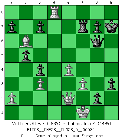 Last move : 0-1 2018 February 16 22:22:2 [Event "FICGS__CHESS__CLASS_D__000241"] [Site "FICGS"] [Date "2017.12.20"] [Round "1"] [White "Vollmer,Steve"] [Black "Lubas,Jozef"] [Result "0-1"] [WhiteElo "1539"] [BlackElo "1499"] 1.d4 Nf6 2.c4 e6 3.g3 Bb4+ 4.Nc3 d5 5.Bg2 O-O 6.Nf3 dxc4 7.Ne5 Nd5 8.Qc2 Nxc3 9.bxc3 Qxd4 10.Bb2 Ba5 11.Nf3 Qg4 12.Rd1 Nc6 13.O-O e5 14.e4 Be6 15.Rd2 Rfd8 16.Rfd1 Rxd2 17.Rxd2 b5 18.Qd1 h6 19.h3 Qh5 20.g4 Qg6 21.Qc2 h5 22.g5 f6 23.h4 Rf8 24.Ba3 Rf7 25.Bc5 Bg4 26.Nh2 fxg5 27.Nxg4 gxh4 28.Nxe5 Nxe5 29.Rd8+ Kh7 30.Kf1 Ng4 31.Bh3 Bb6 32.Bxg4 hxg4 33.Bxb6 g3 34.Qe2 h3 35.f3 g2+ 0-1 Catalan Opening Kingside Castling by player Black (move 5) Kingside Castling by player White (move 13) Player Black won this chess game. Follow this game move after move (download)When the Chess game is over, the Pawn and the King go back to the same box. (Irish saying) Je mehr wir mit Computern analysieren, desto mehr glauben wir an Verteidigung. (Vladimir Kramnik) Bobby Fischer es el mas grande genio de Ajedrez de todos los tiempos. (Alexander Kotov) Mais n'est-ce pas déjà le limiter injurieusement que d'appeler les échecs un jeu? N'est-ce pas aussi une science, un art, ou quelque chose qui, comme le cercueil de Mahomet entre ciel et terre, est suspendu entre l'un et l'autre, et qui réunit un nombre incroyable de contraires ? (Stefan Zweig) There are lots of people who mistake their imagination for their memory. (Josh Bilings)