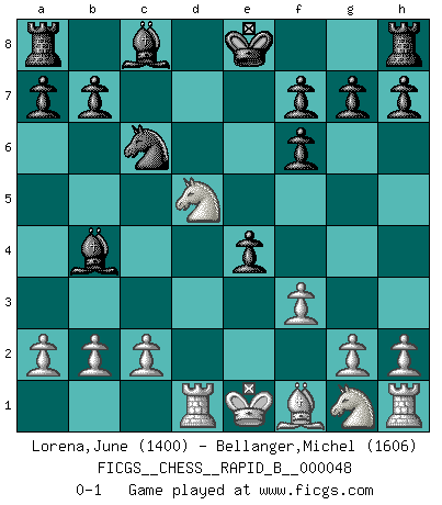 Last move : 0-1 2007 June 15 13:38:10 [Event "FICGS__CHESS__RAPID_B__000048"] [Site "FICGS"] [Date "2007.04.18"] [Round "1"] [White "Lorena,June"] [Black "Bellanger,Michel"] [Result "0-1"] [WhiteElo "1400"] [BlackElo "1606"] 1.d4 Nf6 2.Nc3 d5 3.e4 dxe4 4.f3 c5 5.Be3 cxd4 6.Bxd4 Nc6 7.Bxf6 Qxd1+ 8.Rxd1 exf6 9.Nd5 Bb4+ 0-1 This chess game has been lost on time (started : 2007.04.18 20:33:44) Queen's pawn game Player Black won this chess game. Follow this game move after move (download)The most powerful weapon in Chess is to have the next move. (David Bronstein) Mein Gehirn das ist mein zweitwichtigstes Organ [Aus dem Film: Der Schläfer]. (Woody Allen) Cada Peón es potencialmente una Reina. (James Mason) Les échecs sont un jeu terrible. Si vous n'avez pas le centre, votre adversaire a une position plus libre. Par contre, si vous avez le centre, alors vous avez vraiment quelque chose pour laquelle vous inquiéter ! (Siegbert Tarrasch) The man who strikes first admits that his ideas have given out. (Chinese proverb)
