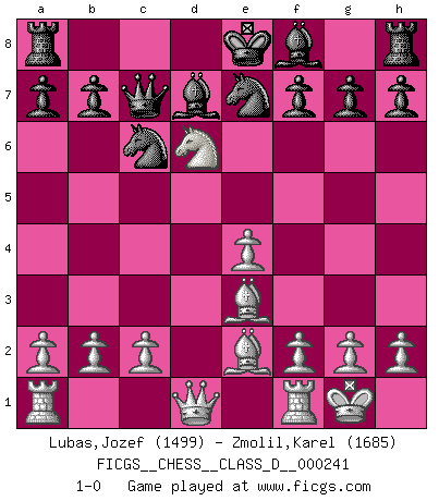 Last move : 1-0 2017 December 24 8:17:1 [Event "FICGS__CHESS__CLASS_D__000241"] [Site "FICGS"] [Date "2017.12.20"] [Round "1"] [White "Lubas,Jozef"] [Black "Zmolil,Karel"] [Result "1-0"] [WhiteElo "1499"] [BlackElo "1685"] 1.e4 e5 2.Nf3 d6 3.d4 exd4 4.Nxd4 Bd7 5.Be2 Nc6 6.O-O Qf6 7.Be3 Nge7 8.Nc3 Ng6 9.Nd5 Qd8 10.Nf5 Nge7 11.Nxc7+ Qxc7 12.Nxd6+ 1-0 Philidor : Exchange variation Kingside Castling by player White (move 6) Player White won this chess game. Follow this game move after move (download)I have added these principles to the law: get the Knights into action before both Bishops are developed. (Emanuel Lasker) Schach ist ein Reich, wo sich die menschliche Phantasie frei entfalten kann. (David Bronstein) Fischer es una tragedia del Ajedrez Americano a la par con Morphy y Pillsbury. (Mig Greengard) Les échecs sont un jeu terrible. Si vous n'avez pas le centre, votre adversaire a une position plus libre. Par contre, si vous avez le centre, alors vous avez vraiment quelque chose pour laquelle vous inquiéter ! (Siegbert Tarrasch) Warrior pose battles inner weakness and wins focus. You see that there is no war within you. You're on your own side, and you are your own strength. (Terri Guillemets)