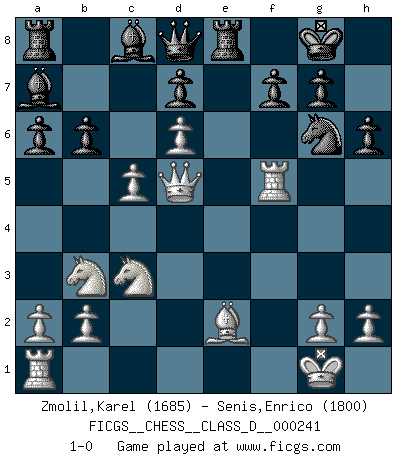 Last move : 1-0 2018 January 14 14:29:1 [Event "FICGS__CHESS__CLASS_D__000241"] [Site "FICGS"] [Date "2017.12.20"] [Round "1"] [White "Zmolil,Karel"] [Black "Senis,Enrico"] [Result "1-0"] [WhiteElo "1685"] [BlackElo "1800"] 1.e4 e6 2.Nf3 c5 3.d4 cxd4 4.Nxd4 Nf6 5.Bd3 Bc5 6.Nb3 Bb6 7.Bg5 O-O 8.O-O Nc6 9.c3 Ne5 10.Be2 h6 11.Bf4 Ng6 12.Bd6 Re8 13.e5 Ne4 14.c4 Nxd6 15.exd6 a6 16.Nc3 Ba7 17.c5 Ne5 18.f4 Ng6 19.f5 exf5 20.Rxf5 b6 21.Qd5 1-0 French defense Kingside Castling by player Black (move 7) Kingside Castling by player White (move 8) Player White won this chess game. Follow this game move after move (download)Excellence at Chess is one mark of a scheming mind. (Sir Arthur Conan Doyle) Ihnen, Herr Lasker, habe ich nur drei Worte zu sagen: Schach und matt. (Siegbert Tarrasch) Coloca el contenido del tablero de Ajedrez en un sombrero, agita las piezas vigorosamente, derrámalas en el tablero desde una altura de medio metro y así obtienes el estilo de Wilhelm Steinitz. (H. E. Bird) Les échecs sont utiles à l'exercice de la faculté de penser et à celle de l'imagination. Car nous devons posséder une méthode élaborée pour atteindre des buts partout où nous devons conduire notre raison. (Leibnitz) Big Chess is a place for big hallucinations. (Thibault de Vassal)