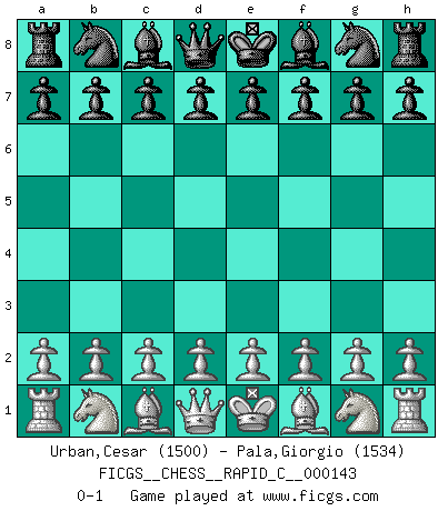 Last move : 0-1 2018 February 15 2:19:34 [Event "FICGS__CHESS__RAPID_C__000143"] [Site "FICGS"] [Date "2018.01.15"] [Round "1"] [White "Urban,Cesar"] [Black "Pala,Giorgio"] [Result "0-1"] [WhiteElo "1500"] [BlackElo "1534"] 0-1 This chess game has been lost on time (started : 2018.01.15 22:39:46) Player Black won this chess game. Follow this game move after move (download)Bobby Fischer is the greatest Chess genius of all time ! (Alexander Kotov) Die Partien sind immer verschieden, die Interviews immer die gleichen. (Garry Kasparov) El Ajedrez es un cuento de Hadas de las 1001 metidas de pata. (Savielly Tartakower) Ce qui caractérise les parties de combat, c'est que si le défenseur a constamment de difficiles problèmes à résoudre, l'attaquant doit chercher sans relâche de nouvelles possibilités d'attaque. (Koblentz) Once you start thinking you have nothing left to learn, you have everything to learn. (Steve Badget)
