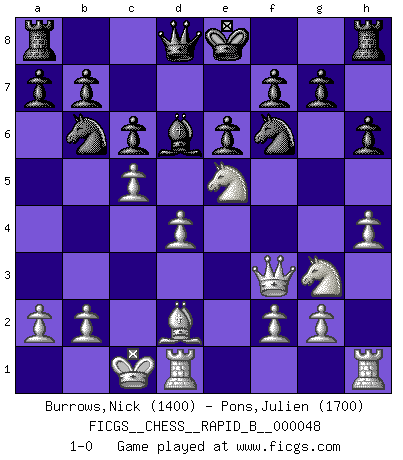 Last move : 1-0 2007 June 8 12:47:14 [Event "FICGS__CHESS__RAPID_B__000048"] [Site "FICGS"] [Date "2007.04.18"] [Round "1"] [White "Burrows,Nick"] [Black "Pons,Julien"] [Result "1-0"] [WhiteElo "1400"] [BlackElo "1700"] 1.e4 c6 2.d4 d5 3.Nc3 dxe4 4.Nxe4 Bf5 5.Ng3 Bg6 6.h4 h6 7.Nf3 Nf6 8.Ne5 Bh7 9.Bd3 Bxd3 10.Qxd3 e6 11.Bf4 Nbd7 12.O-O-O Nd5 13.Qf3 N7f6 14.Bd2 Bd6 15.c4 Nb6 16.c5 1-0 This chess game has been lost on time (started : 2007.04.18 20:33:44) Caro-Kann : Classical, 6.h4 Queenside Castling by player White (move 12) Player White won this chess game. Follow this game move after move (download)Blessed be the memory of him who gave the world this immortal game. (A. G. Gardiner) Ich hatte meine größten Erfolge, als ich 47 Jahre alt war. Kasparow war noch nicht mal 42 und hat das Schach schon im Stich gelassen. (Viktor Kortschnoi) Con o sin el título, Bobby Fischer fue sin lugar a dudas el mas grande jugador de su época. (Burt Hochberg) Si je n'étais pas joueur d'échecs, je serais le meilleur dans quelque chose d'autre. (Anatoli Karpov) The Internet isn't free. It just has an economy that makes no sense to capitalism. (Brad Shapcott)