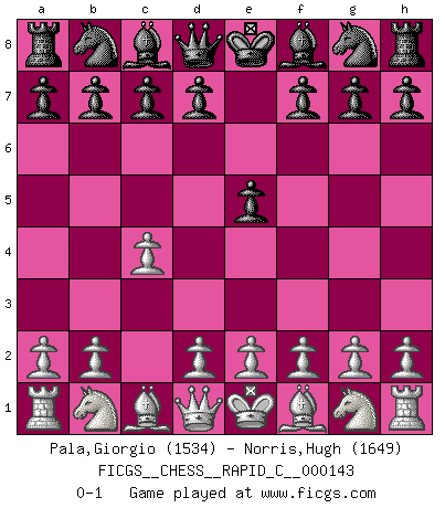 Last move : 0-1 2018 February 13 2:15:34 [Event "FICGS__CHESS__RAPID_C__000143"] [Site "FICGS"] [Date "2018.01.12"] [Round "1"] [White "Pala,Giorgio"] [Black "Norris,Hugh"] [Result "0-1"] [WhiteElo "1534"] [BlackElo "1649"] 1.c4 e5 0-1 This chess game has been lost on time (started : 2018.01.12 15:38:59) English Opening Player Black won this chess game. Follow this game move after move (download)A passed Pawn increases in strength as the number of pieces on the board diminishes. (Capablanca) Obendrein hat der FIDE-Präsident den Revolutionsführer Gaddafi zum »Großmeister« ernannt, am Ende der WM. Das ist lächerlich! (Joel Lautier) Tu no necesitas jugar muy bien, únicamente ayudar a tu oponenet a que juegue muy mal. (Genrikh Chepukaitis) On est toujours la mazette de quelqu'un d'autre. (Anonyme) I feel so... helpless. (C-3PO in Star Wars ep.3)