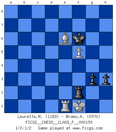 Last move : 1/2-1/2 2018 January 2 23:35:35 [Event "FICGS__CHESS__CLASS_F__000193"] [Site "FICGS"] [Date "2017.12.22"] [Round "1"] [White "Leurette,Marc-Antoine"] [Black "Bromo,Alexis"] [Result "1/2-1/2"] [WhiteElo "1183"] [BlackElo "0970"] 1.e4 e5 2.Nf3 Nc6 3.Bc4 h6 4.d4 d6 5.dxe5 dxe5 6.Qxd8+ Kxd8 7.O-O Nf6 8.Nc3 Bc5 9.a3 a6 10.b4 Ba7 11.Re1 Ng4 12.Be3 Nxe3 13.fxe3 Bg4 14.b5 axb5 15.Bxb5 Bxf3 16.gxf3 g5 17.Nd5 Ne7 18.Kf2 f5 19.Nxe7 Kxe7 20.exf5 Kf6 21.Bd7 Rad8 22.Be6 h5 23.c4 g4 24.Kg3 Kg5 25.f4+ exf4+ 26.exf4+ Kf6 27.h4 Rd3+ 28.Kg2 Rhd8 29.Ra2 R8d4 30.Rf1 Rh3 31.Rh1 R4d3 32.Rxh3 Rxh3 33.Rd2 Rxa3 34.Rd7 Ra2+ 35.Kg3 Bf2+ 36.Kg2 Bxh4 37.Kf1 Rf2+ 38.Kg1 Rxf4 39.Rf7+ Ke5 40.Rxc7 Bf2+ 41.Kg2 b6 42.Rc6 h4 43.Rc8 h3+ 44.Kh2 Be1 45.c5 Rf2+ 46.Kg1 bxc5 47.Rxc5+ Kf6 48.Rc1 Rg2+ 49.Kf1 g3 50.Rxe1 Rf2+ 51.Kg1 Rg2+ 52.Kf1 Rf2+ 1/2-1/2 King's pawn game Kingside Castling by player White (move 7) 10 pieces endgame at move 46 : White KRBP , Black KRBPPP WHITE : King + 1 Rook 1 Bishop 1 Pawn BLACK : King + 1 Rook 1 Bishop 3 Pawns 9 pieces endgame at move 47 : White KRBP , Black KRBPP WHITE : King + 1 Rook 1 Bishop 1 Pawn BLACK : King + 1 Rook 1 Bishop 2 Pawns 8 pieces endgame at move 50 : White KRBP , Black KRPP WHITE : King + 1 Rook 1 Bishop 1 Pawn BLACK : King + 1 Rook 2 Pawns This chess game ended in a draw. Follow this game move after move (download)Chess is so inspiring that I do not believe a good player is capable of having an evil thought during the game. (Wilhelm Steinitz) Es hat in meinem Leben Zeiten gegeben, in denen das Schachspiel, wenn nicht zum Lebenszweck, so doch zu einem regelrechten Lebensersatz geworden ist. Man fühlt sich in solchen Zeiten nicht so, als besäße man eine göttliche Gabe, sondern eher so, als sei man von ihr besessen. (Garry Kasparov) El tablero es el mundo, las piezas es el fenomeno del universo, las reglas del juego son lo que llamamos leyes de la naturaleza y el jugador del lado opuesto, se encuentra oculto a nuestra vista. (Thomas Huxley) Si rien de grave n'est détecté lors de l'analyse d'une position, on joue alors le coup. Seconde règle de Blumenfeld. There's always a bigger fish. (Qui-Gon Jinn in Star Wars ep.1)