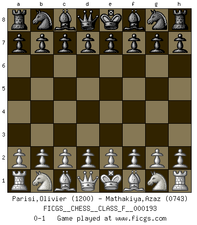 Last move : 0-1 2018 January 31 12:19:44 [Event "FICGS__CHESS__CLASS_F__000193"] [Site "FICGS"] [Date "2017.12.22"] [Round "1"] [White "Parisi,Olivier"] [Black "Mathakiya,Azaz"] [Result "0-1"] [WhiteElo "1200"] [BlackElo "0743"] 0-1 This chess game has been lost on time (started : 2017.12.22 1:20:49) Player Black won this chess game. Follow this game move after move (download)Chess is imagination. (David Bronstein) Wenn es im Universum noch irgendwo intelligente Lebewesen gibt, dann kennen sie Go. (Emanuel Lasker) Jugadores de primera clase pierden en contra de jugadores de segunda clase porque los jugadores de segunda clase a veces juegan una partida de primer clase. (Siegbert Tarrasch) Les réformistes prétendent que les progrès de la théorie conduiront à la disparition des échecs, et qu'il faut, pour leur rendre vie, en remanier les règles. En réalité, qu'exprime cette affirmation? Le mépris de l'intuition, de l'imagination et de tous les autres éléments qui font des échecs un art. (Alexander Alekhine) This is where the fun begins. (Anakin Skywalker in Star Wars ep.3)