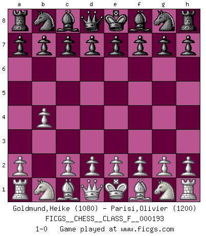 Last move : 1-0 2018 February 1 0:25:14 [Event "FICGS__CHESS__CLASS_F__000193"] [Site "FICGS"] [Date "2017.12.22"] [Round "1"] [White "Goldmund,Heike"] [Black "Parisi,Olivier"] [Result "1-0"] [WhiteElo "1080"] [BlackElo "1200"] 1.b4 1-0 This chess game has been lost on time (started : 2017.12.22 1:20:49) Polish (Sokolsky) opening Player White won this chess game. Follow this game move after move (download)Alekhine is a poet who creates a work of art out of something that would hardly inspire another man to send home a picture post card. (Max Euwe) Ich glaube, ich kenne inzwischen die Gründe für mein Versagen: schachliche Charakterfehler. Ich war nie ein Wunderkind und in meiner gesamten menschlichen Entwicklung immer zu langsam. (Viktor Kortschnoi) Si el ingenio solamente fuese necesario para lucirse, las mujeres serían las mejores jugadoras de Ajedrez del mundo. (Albin) Seul un grand joueur sait à quel point il joue faiblement. (Xavier Tartacover) No, I am still playing. (Anatoly Karpov)