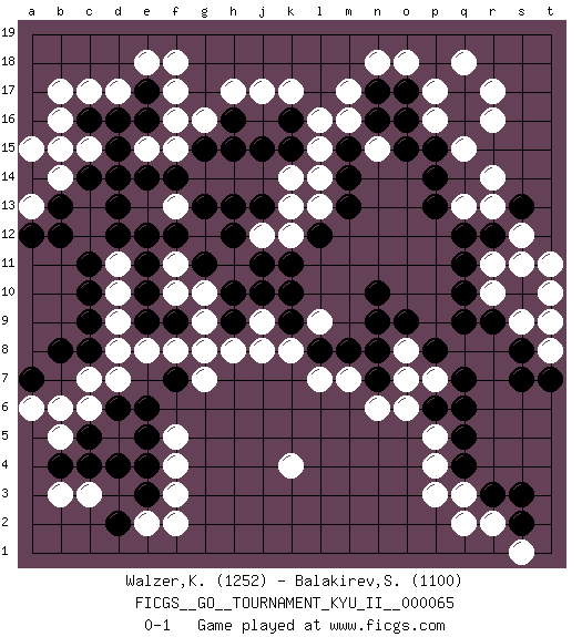 Last move : 0-1 2018 February 9 14:10:16 [Event "FICGS__GO__TOURNAMENT_KYU_II__000065"] [Site "FICGS"] [Date "2017.12.22"] [Round "1"] [Black "Walzer,Karel"] [White "Balakirev,Stanislav"] [Result "0-1"] [Rating 1 "1252"] [Rating 2 "1100"] 1.d4 q3 2.q16 c17 3.d16 d17 4.e16 f18 5.c16 r14 6.r12 r17 7.q17 r16 8.p14 g16 9.d13 c6 10.c8 d8 11.c9 d7 12.e10 f4 13.e5 f5 14.e6 f8 15.c5 b5 16.b4 b6 17.e4 f3 18.e3 k4 19.d6 c7 20.q5 p5 21.q4 p4 22.r3 p3 23.q6 r2 24.s3 o7 25.q9 q15 26.p15 p16 27.o16 p17 28.o17 q18 29.k16 b16 30.b15 b17 31.k10 m16 32.m15 n15 33.o15 l15 34.m14 l16 35.n16 k17 36.j15 l14 37.j13 j17 38.g15 d9 39.c10 d10 40.c11 f13 41.g13 g12 42.h13 d11 43.d12 f11 44.m13 k8 45.m8 l9 46.n10 r10 47.q10 r11 48.q12 s12 49.s13 t11 50.r9 r13 51.q11 s9 52.s10 s11 53.s8 t10 54.n9 m7 55.l8 l7 56.k9 j8 57.h10 g9 58.f7 g7 59.p8 l13 60.l12 k12 61.k11 j12 62.h12 k13 63.j11 f15 64.h15 f16 65.e14 e15 66.d15 b14 67.c14 a15 68.b13 c15 69.b8 a13 70.b12 b15 71.e17 e18 72.f14 e2 73.d2 f2 74.e11 f10 75.e12 c3 76.c4 b3 77.s2 q2 78.e9 e8 79.f9 g10 80.h9 h8 81.f12 n18 82.g11 g8 83.n7 n6 84.n8 t8 85.s7 p7 86.q7 o8 87.o9 j9 88.j10 o18 89.h16 h17 90.n17 m17 91.k15 s1 92.a7 a6 93.p6 o6 94.t7 t9 95.a12 f17 96.d14 q13 97.p13 k14 0-1 Here are the names of the openings (joseki) played in the four corners : Corner d16 : c17 d16 San-San (Sam-Sam, San-San) 3-3 Point. The San-San (3-3) point, emphasizing territory at the expense of influence. Kata-tsuki (shoulder hit). The shoulder-hit is the traditional answer to the 3-3. The direction of White 3 depends on the positions on the side. Crawling once may be the premise for a follow-up move of sliding with a knight's move in the opposite direction. If White plays 3 at 3-4 (to the right), the follow-on knight's move is then played at the top (e.g. 3-4, 4-5, 5-2). White's knight's move reduces territory potential on the side it is played. Corner q16 : q16 r14 Hoshi (Hwajeom, Seongjeom, Xingwei`) 4-4 Point. The star or hoshi (4-4) point, emphasizing influence at the potential expense of territory. Ikken Kakari (Hankan Keolch'im, Yi Gua`jiao~, 1-Space Low Approach). White 2 is the standard approach move to the 4-4. Corner d4 : d4 c6 Hoshi (Hwajeom, Seongjeom, Xingwei`) 4-4 Point. The star or hoshi (4-4) point, emphasizing influence at the potential expense of territory. Ikken Kakari (Hankan Keolch'im, Yi Gua`jiao~, 1-Space Low Approach). White 2 is the standard approach move to the 4-4. Corner q4 : q3 q5 Komoku (Somok, Xiao~mu`) 3-4 Point. The komoku (3-4) point is the traditional corner enclosure move.. Ikken Takagakari (Hankan Nop'dakeolch'im, Yi Gaogua`jiao~, 1-Space High Approach). The 5-4 approach move has become more popular in modern times, as modern Go emphasizes speed and influence. Player White won this Go (weiqi, baduk) game. Follow this game move after move (download)Go uses the most elemental materials and concepts - line and circle, wood and stone, black and white - combining them with simple rules to generate subtle strategies and complex tactics that stagger the imagination. (Iwamoto Kaoru, 9 dan professional Go player and former Honinbo title holder) Memory is a crazy woman that hoards colored rags and throws away food. (Austin O'Malley)