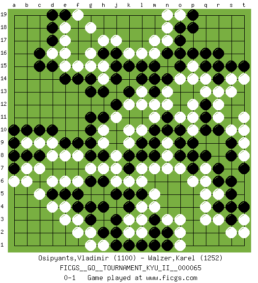 Last move : 0-1 2018 January 31 22:1:53 [Event "FICGS__GO__TOURNAMENT_KYU_II__000065"] [Site "FICGS"] [Date "2017.12.22"] [Round "1"] [Black "Osipyants,Vladimir"] [White "Walzer,Karel"] [Result "0-1"] [Rating 1 "1100"] [Rating 2 "1252"] 1.q16 d4 2.d17 q3 3.c15 d16 4.c16 e16 5.d10 c7 6.k4 m4 7.g4 q5 8.r10 q14 9.o16 r15 10.r16 r11 11.q10 p12 12.r7 k16 13.h16 e17 14.d18 h17 15.j16 j17 16.k15 l16 17.j14 n17 18.o17 c9 19.c10 f3 20.g3 l3 21.f4 e3 22.e14 k10 23.h11 q7 24.r6 q6 25.s4 s2 26.q11 r12 27.q12 q13 28.n10 n9 29.o9 n8 30.o8 o7 31.q8 r5 32.s5 f6 33.h6 k3 34.j3 k6 35.j5 h7 36.g6 g7 37.j2 h10 38.g11 l12 39.n14 s13 40.e5 d6 41.f5 e6 42.k5 l6 43.b10 b9 44.a9 a8 45.a10 n13 46.m14 n12 47.m10 k12 48.n16 m17 49.o18 e18 50.e19 f19 51.d19 g18 52.l9 k9 53.l8 m7 54.k8 j8 55.g10 h9 56.g9 f8 57.f9 d9 58.e9 e8 59.j12 j11 60.k13 n18 61.m1 o2 62.n2 k2 63.k1 n3 64.m2 o1 65.l1 g2 66.h2 f2 67.d5 c5 68.b8 b7 69.a7 a6 70.c8 d8 71.a8 b6 72.d15 f15 73.f14 g15 74.g13 h14 75.h13 g16 76.j15 o11 77.o10 l13 78.l14 o14 79.o15 p15 80.p16 s10 81.s9 t11 82.s15 s14 83.q15 p14 84.r14 o19 85.p19 n19 86.p18 t9 87.s8 r3 88.r4 q4 89.s3 t3 90.s6 j6 91.h4 m16 92.l5 m5 93.m3 l4 94.p7 p6 95.p8 l10 96.m8 n7 97.m9 m11 98.n11 p11 99.m13 m12 100.t4 t2 101.g8 p10 102.p9 t14 103.t15 t8 104.t7 t10 105.k7 j7 106.n1 o3 107.m15 h1 108.j1 g1 109.r15 r13 110.pass e4 111.pass l2 112.g14 h15 113.l15 e15 114.h8 l7 115.pass pass 116.pass pass 0-1 Here are the names of the openings (joseki) played in the four corners : Corner q16 : q16 q14 Hoshi (Hwajeom, Seongjeom, Xingwei`) 4-4 Point. The star or hoshi (4-4) point, emphasizing influence at the potential expense of territory. Ikken Takagakari (Hankan Nop'dakeolch'im, Yi Gaojia, 1-Space High Approach). Black typically responds at 6-4 or 3-10. Black 4-10 is played when Black finds play on the right side advantageous. Black 4-8 or 3-8 may be played when Black has support at top. Player White won this Go (weiqi, baduk) game. Follow this game move after move (download)Don't defend - extend ! (Bill Taylor) Luck is what you have left over after you give 100 percent. (Langston Coleman)